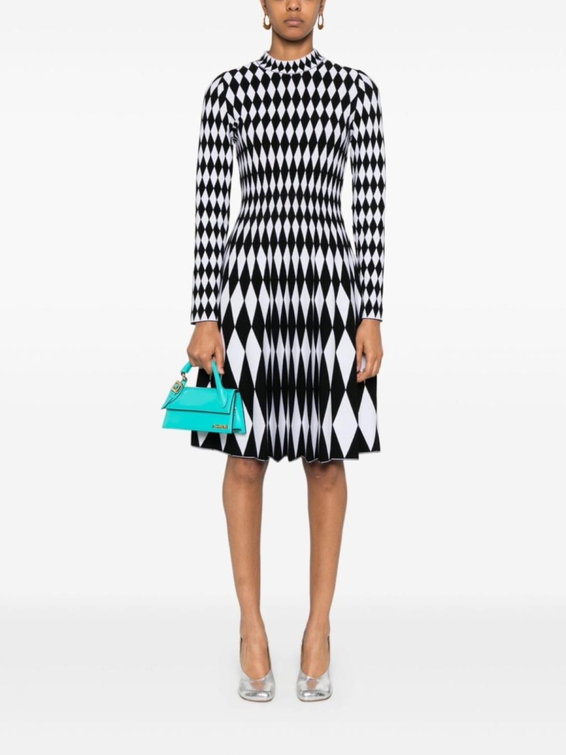 Черный/белый, без застежки, принт с геометричным узором, высокий воротник, длинные рукава, приталенный силуэт, складки, расклешенный подол