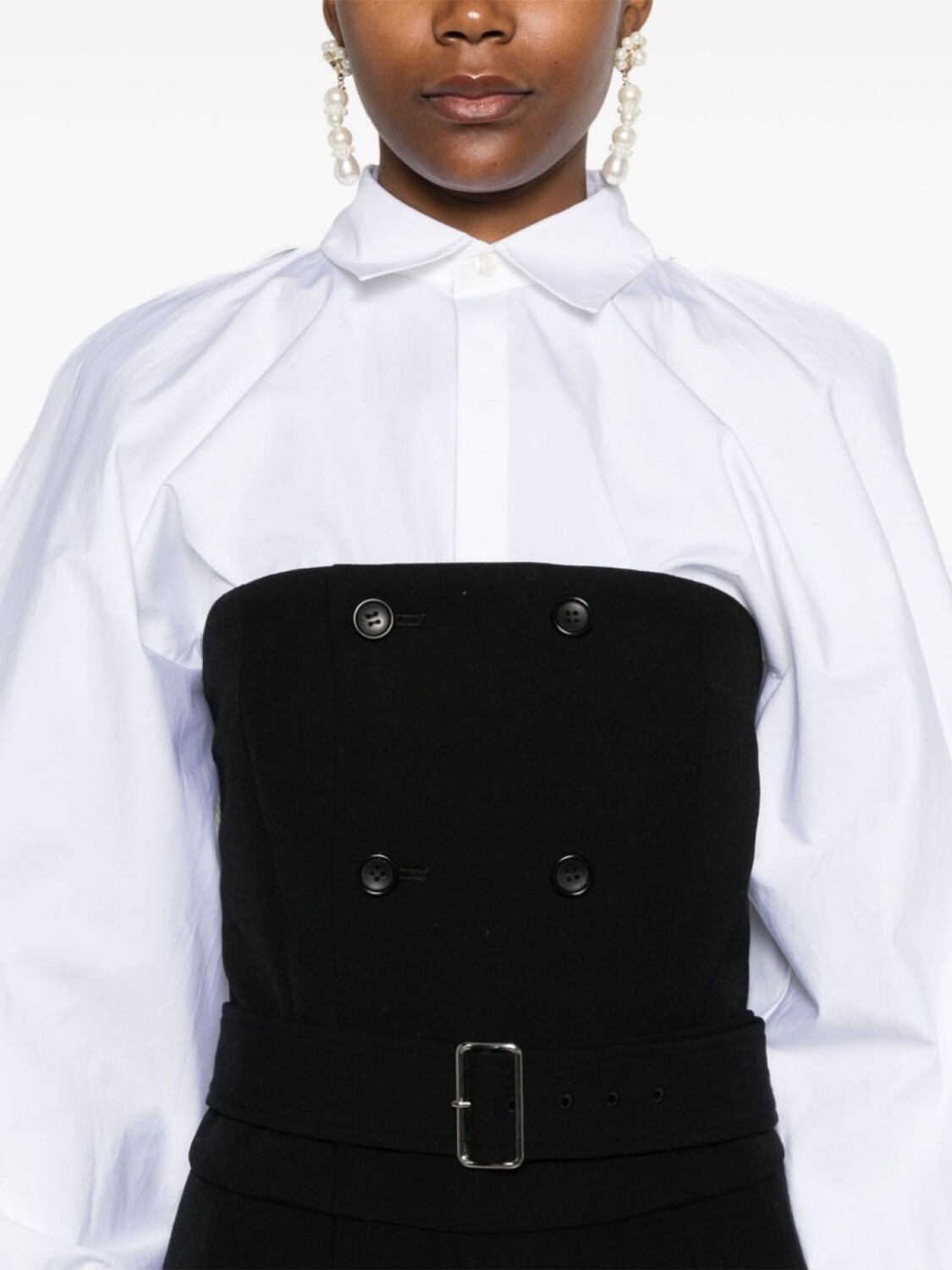 Черная шерстяная саржевая юбка в складку, двубортная, застежка на пуговицы, смещенная от центра застежка-молния спереди, квадратный вырез, без бретелек, лиф на косточках, пояс на талии, два боковых врезных кармана, без подкладки, прямой подол средней длины