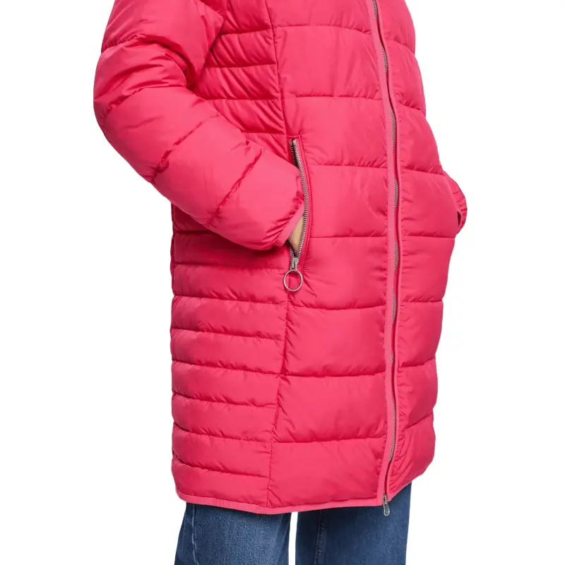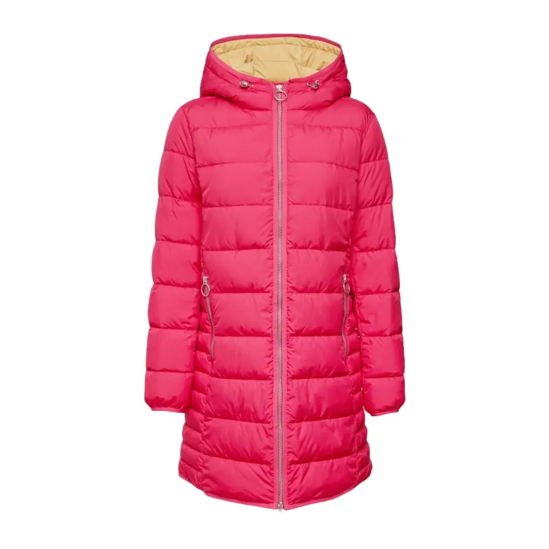 Куртка выполнена из стеганного текстиля. Модель удлиненного приталенного кроя. Детали: застежка на молнию, передние карманы.