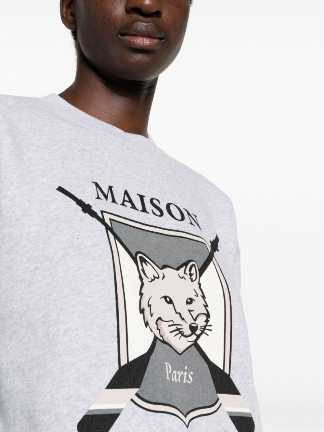 Светло-серый, разноцветный, хлопок, трикотажный материал, эффект меланж, знаковый узор с изображением лисы, логотип спереди, графичный принт спереди, круглый вырез, приспущенные плечи и длинные рукава.
