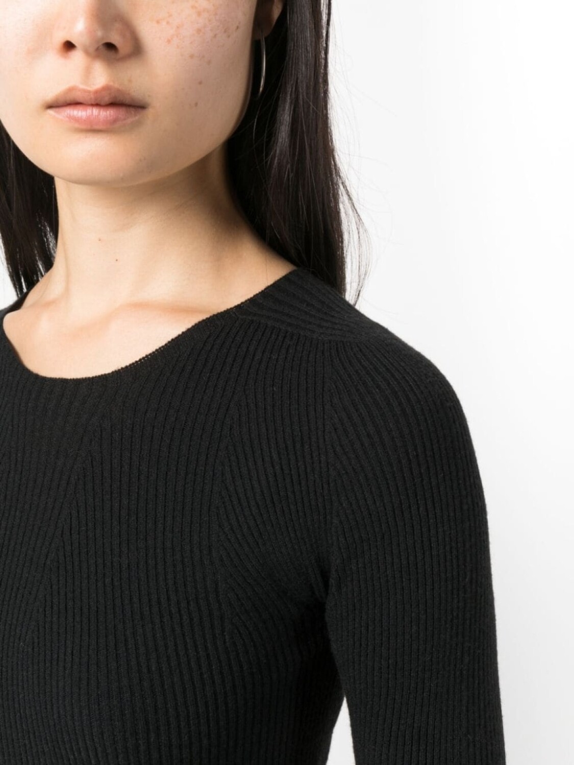 Черный, эластичный материал, трикотаж в рубчик, бесшовная модель, круглый вырез, длинные рукава и прямой подол.