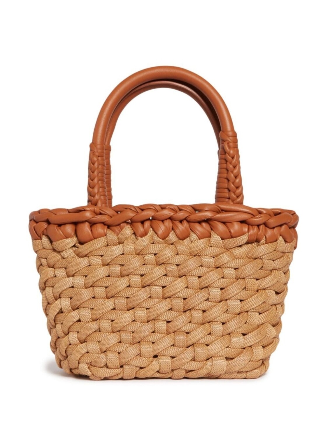 Песочно-коричневый, бежевый, рафия, кожаная отделка, переплетенный дизайн, треугольный логотип, дизайн с открытым верхом, две закругленные верхние ручки, основное отделение и съемная косметичка.