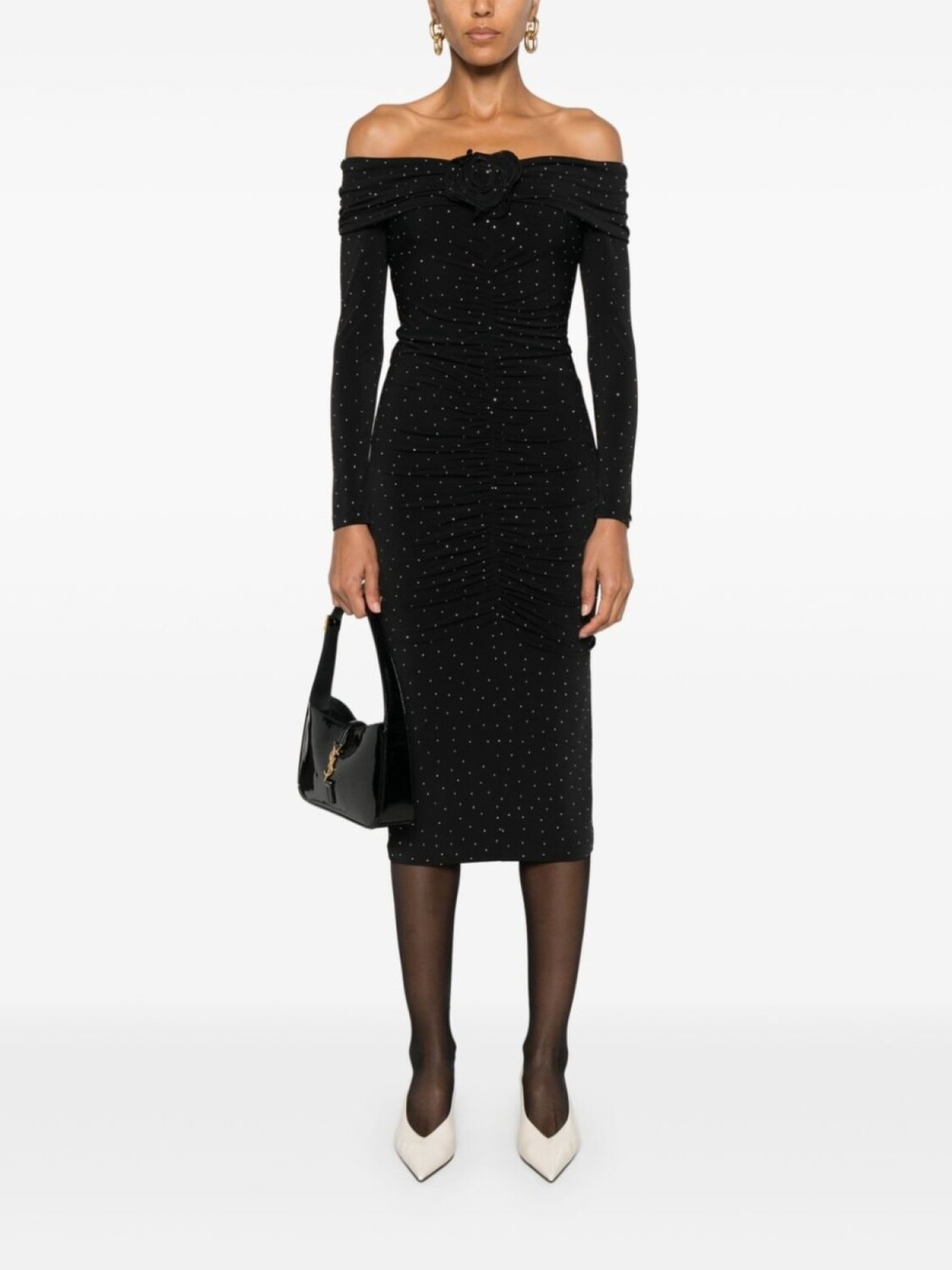 Черный, эластичный материал, кристаллы, потайная застежка на молнии сбоку, драпированная юбка, загнутые края, цветочная аппликация, открытые плечи, длинные рукава, шлица по центру сзади, цельная подкладка, прямой подол, средней длины