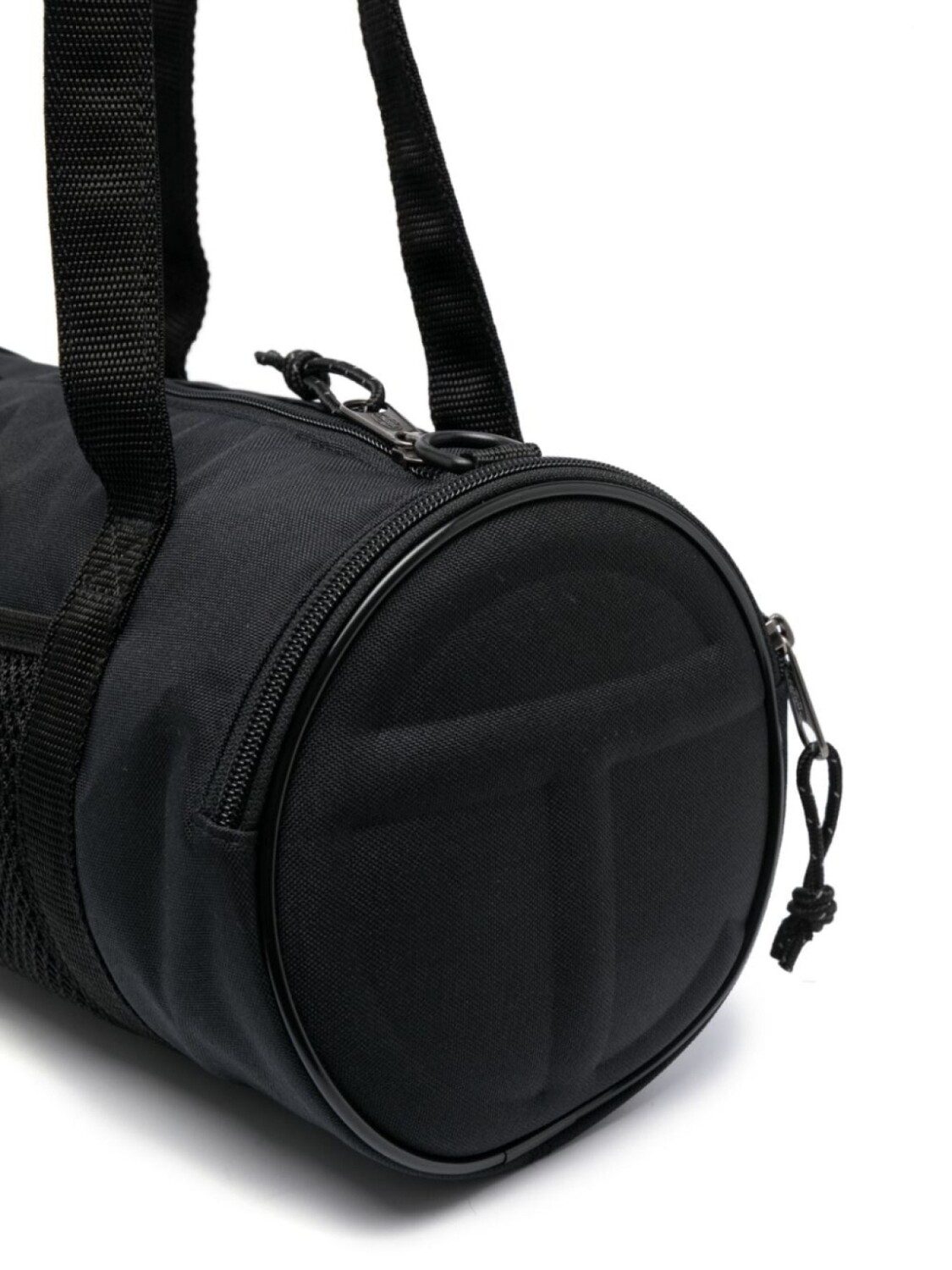 Модель круглой формы, тисненый логотип сбоку, нашивка с логотипом спереди, сетка, застежка на молнии сверху, два кармана на молнии по бокам и регулируемый ремень на плечо.