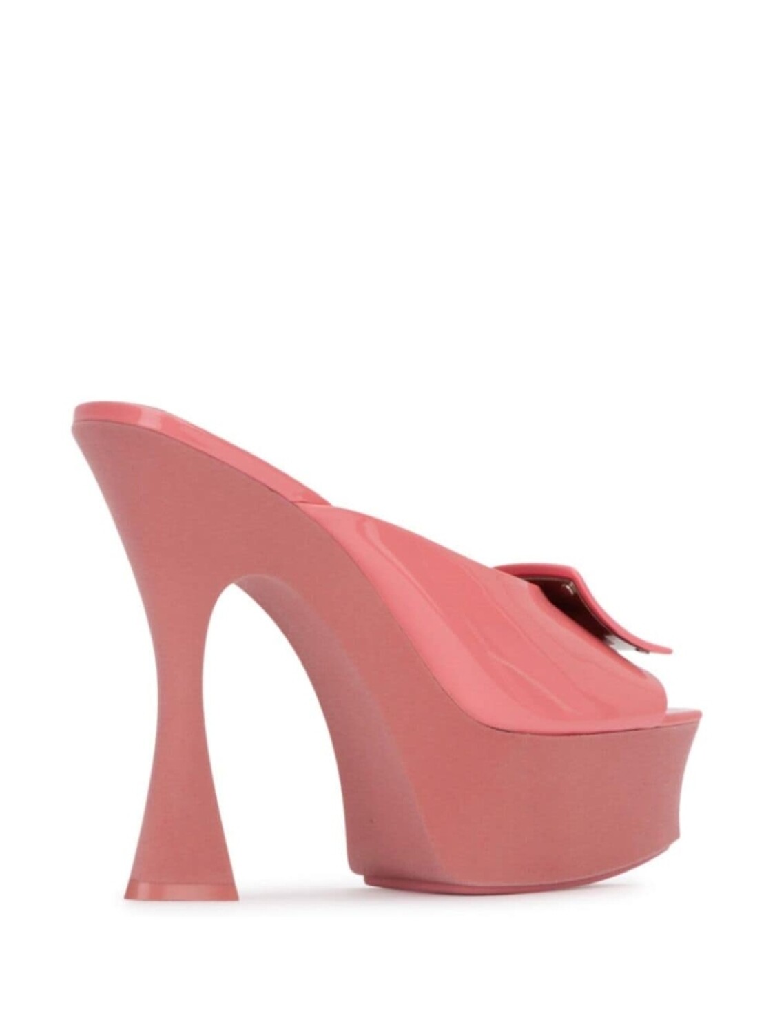 Кораллово-розовая телячья кожа, лакированная отделка, декоративная пряжка, высокий скульптурный каблук, модель slip-on, открытый носок, подошва на платформе