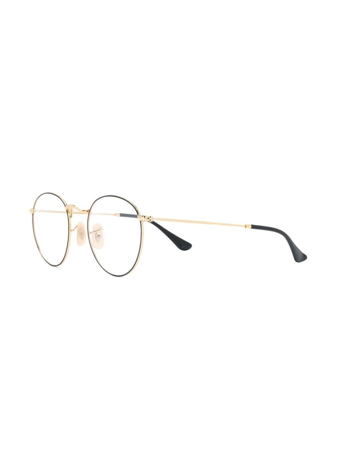 Очки в круглой оправе от Ray Ban (Рэй Бан). Золотистая фурнитура, прямые дужки с остро изогнутыми концами и логотип бренда на оправе. Цвет: черный. Модель в стиле унисекс.