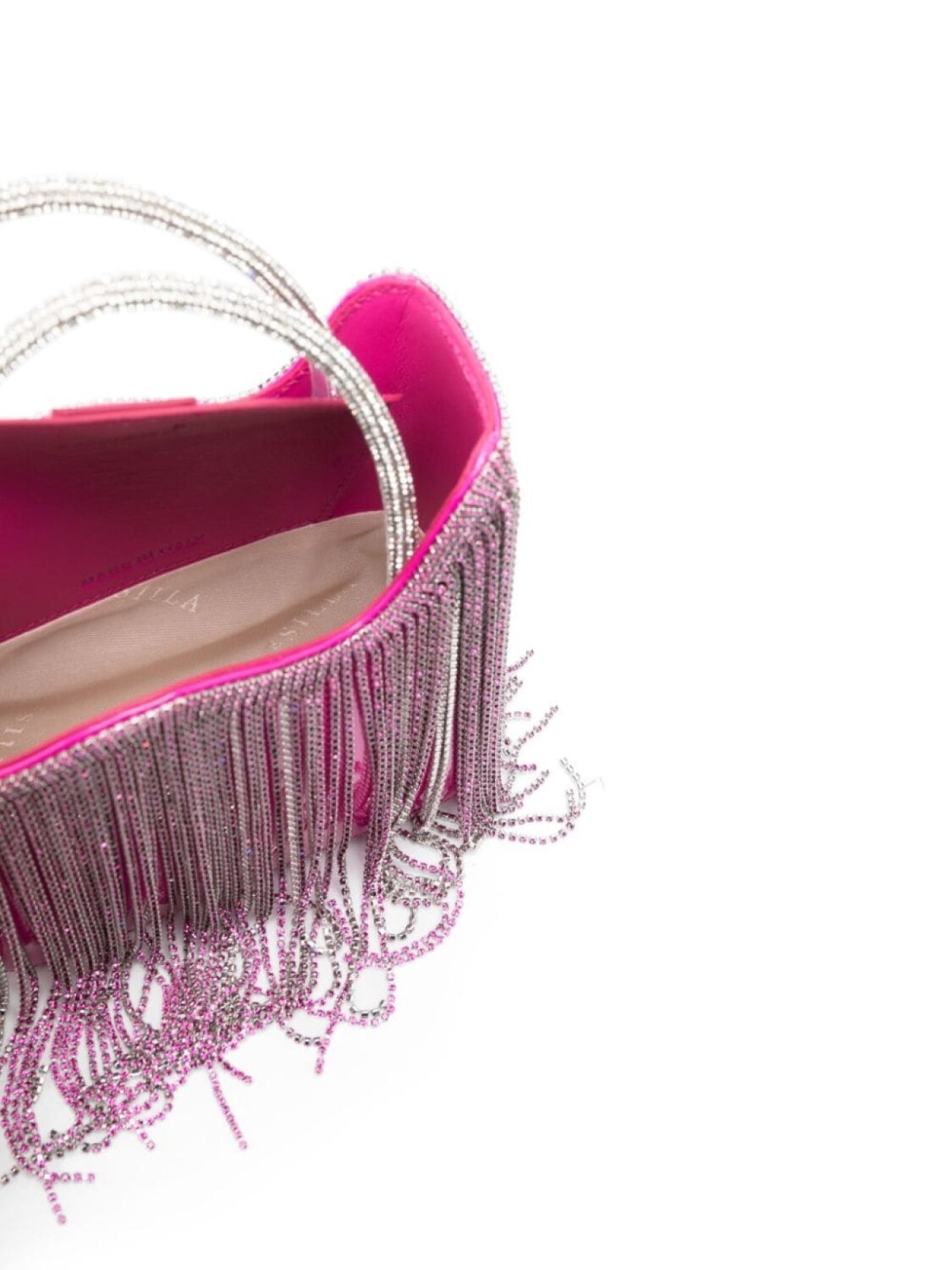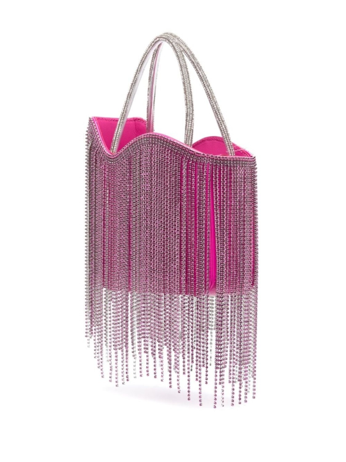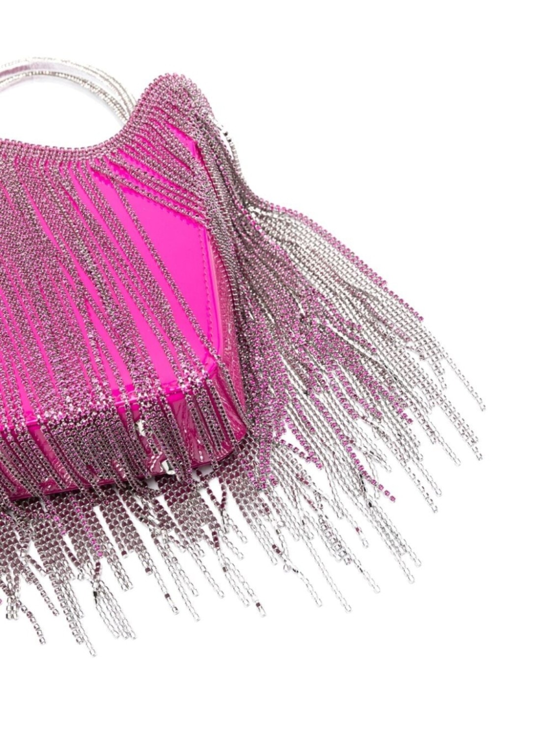 Ярко-розовый, серебристый, телячья кожа, лакированная отделка, декор из кристаллов, бахрома, две закругленные верхние ручки, съемный регулируемый ремень на плечо и потайная застежка на магните.