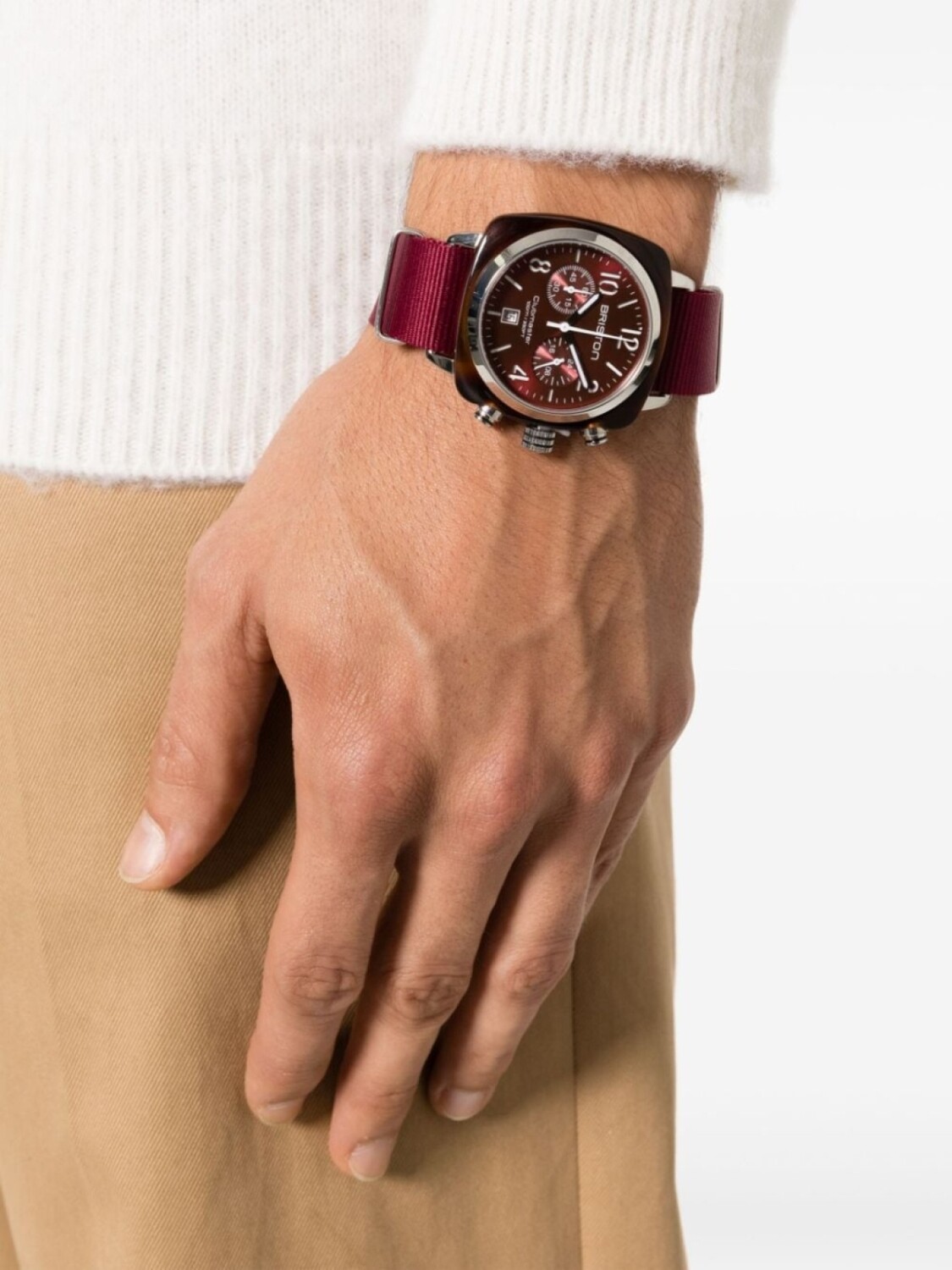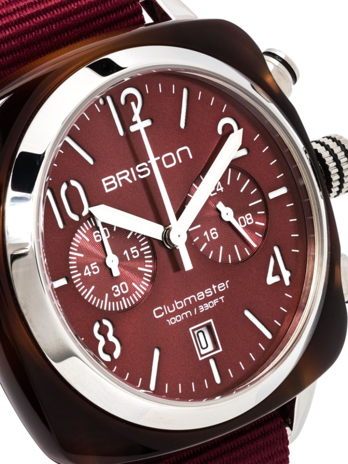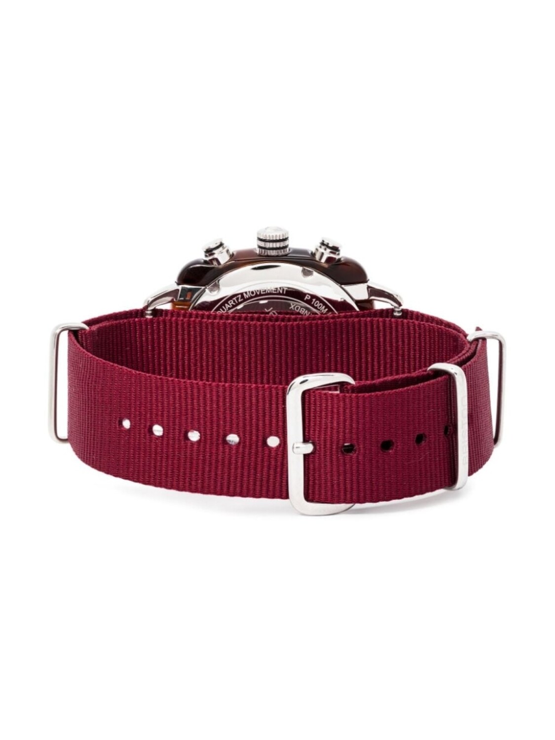 Нержавеющая сталь, кварцевый механизм, арабский циферблат, циферблат с индексами, бордовый, выпуклый корпус, бордовый, ремешек NATO, застежка на липучке спереди, хронограф, индикатор даты, часы, минуты и секунды и водонепроницаемость до 100 метров/10 АТМ.