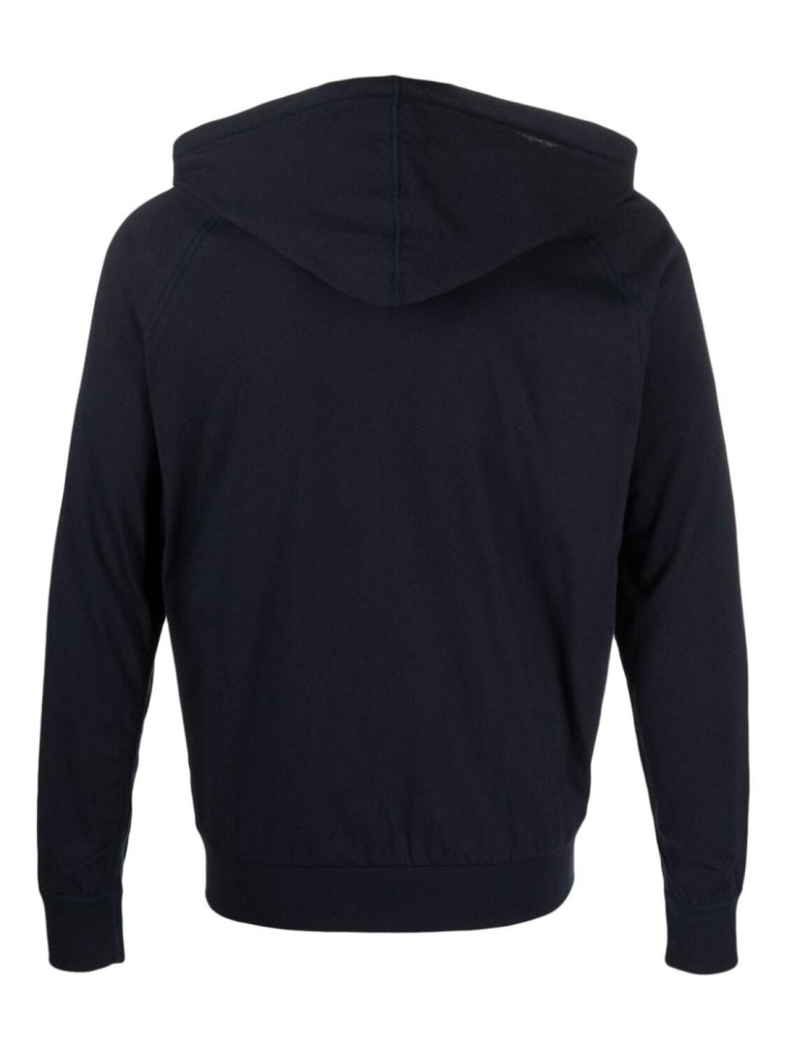 Темно-синий, хлопок, ткань джерси, радужный узор, логотип-аппликация, затягивающийся на шнурок капюшон, застежка на молнии спереди, длинные рукава, два накладных кармана по бокам и прямой подол.