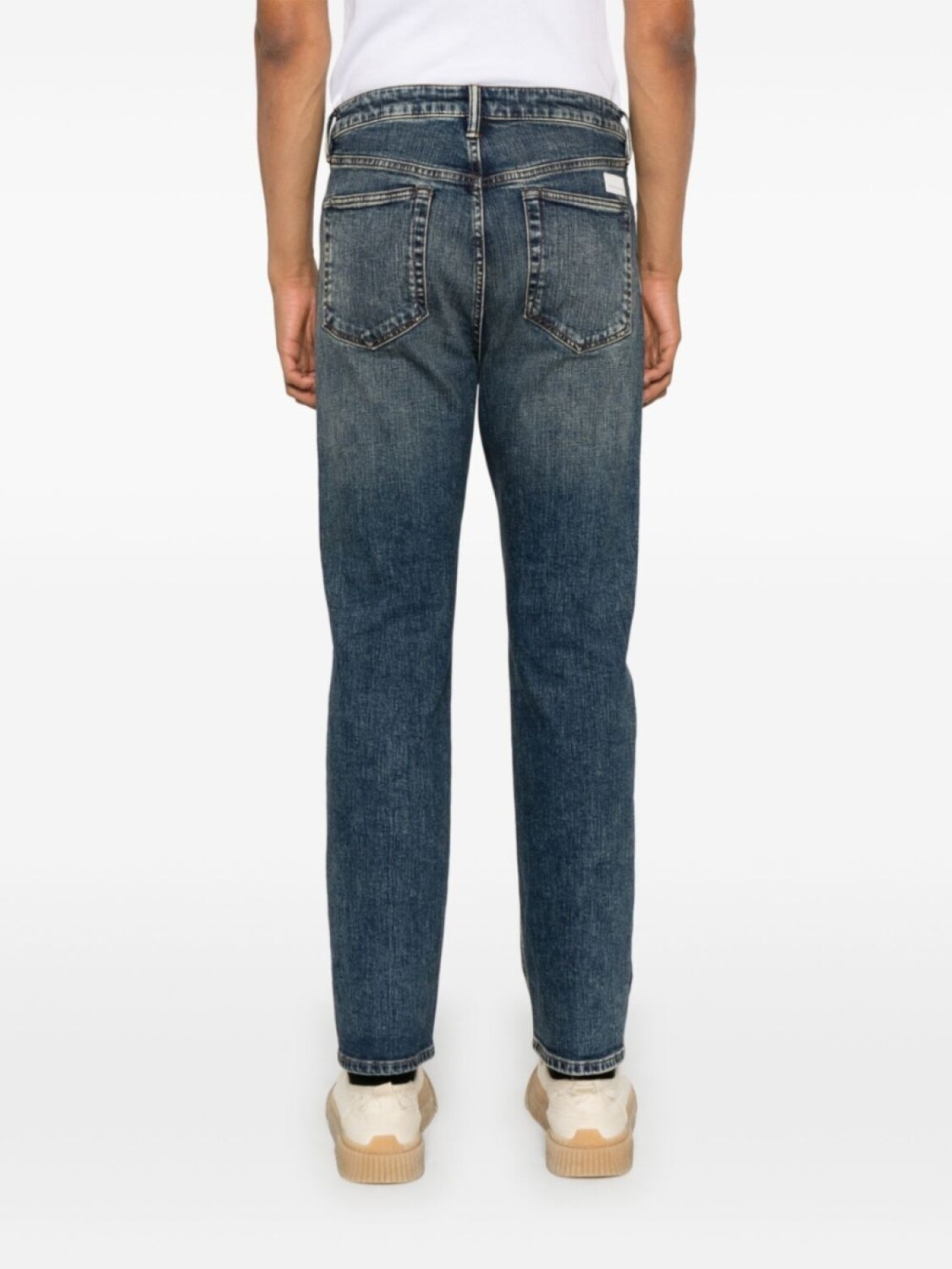 Индиго, смесовый хлопок, деним, потайная застежка на молнии и пуговицах, петли для ремня, классическая пятикарманная модель, нашивка с логотипом сзади, прямой крой