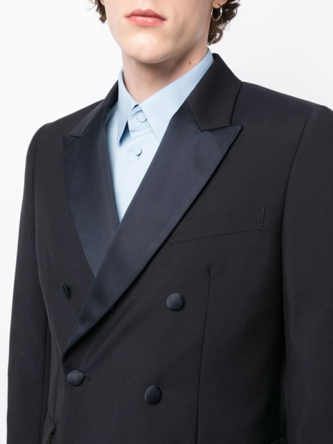 Черный, смесь шерсти и мохера, заостренные лацканы, двубортная застежка на кнопки, длинные рукава, манжеты на пуговицах, прорезной карман на груди, два кармана с клапанами по бокам, шлица по центру сзади и прямой подол.