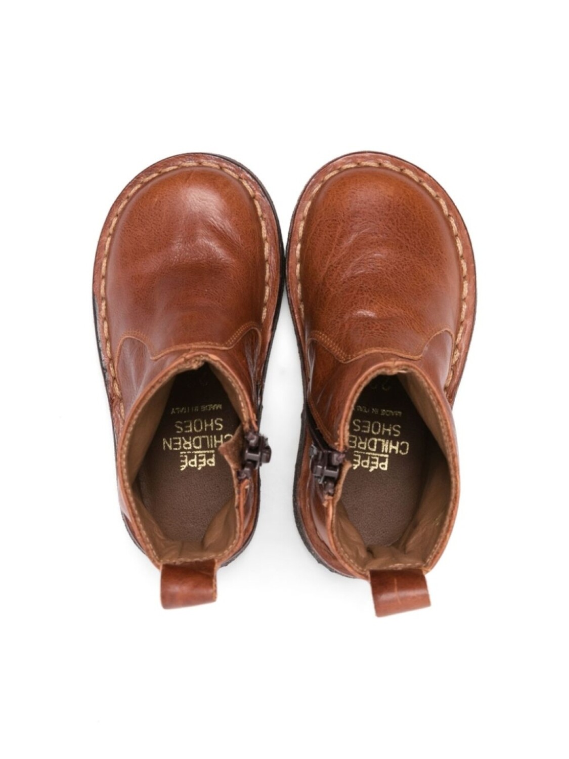 Коньячный коричневый, телячья кожа, строчка в тон, петля для подтягивания сзади, закругленный носок, застежка на молнии сбоку, кожаная стелька с логотипом, плоская резиновая подошва и высота по щиколотку.