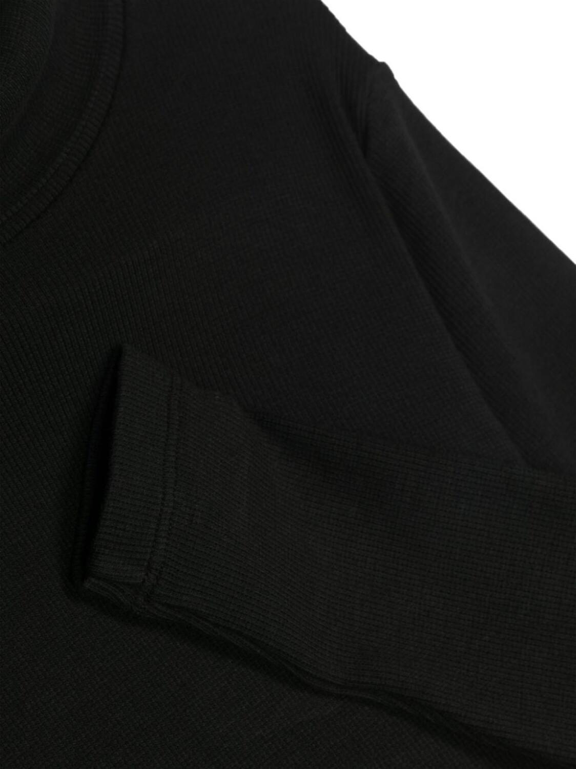 Черный, смесовый хлопок, ткань в мелкий рубчик, высокий воротник, длинные рукава и прямой подол.