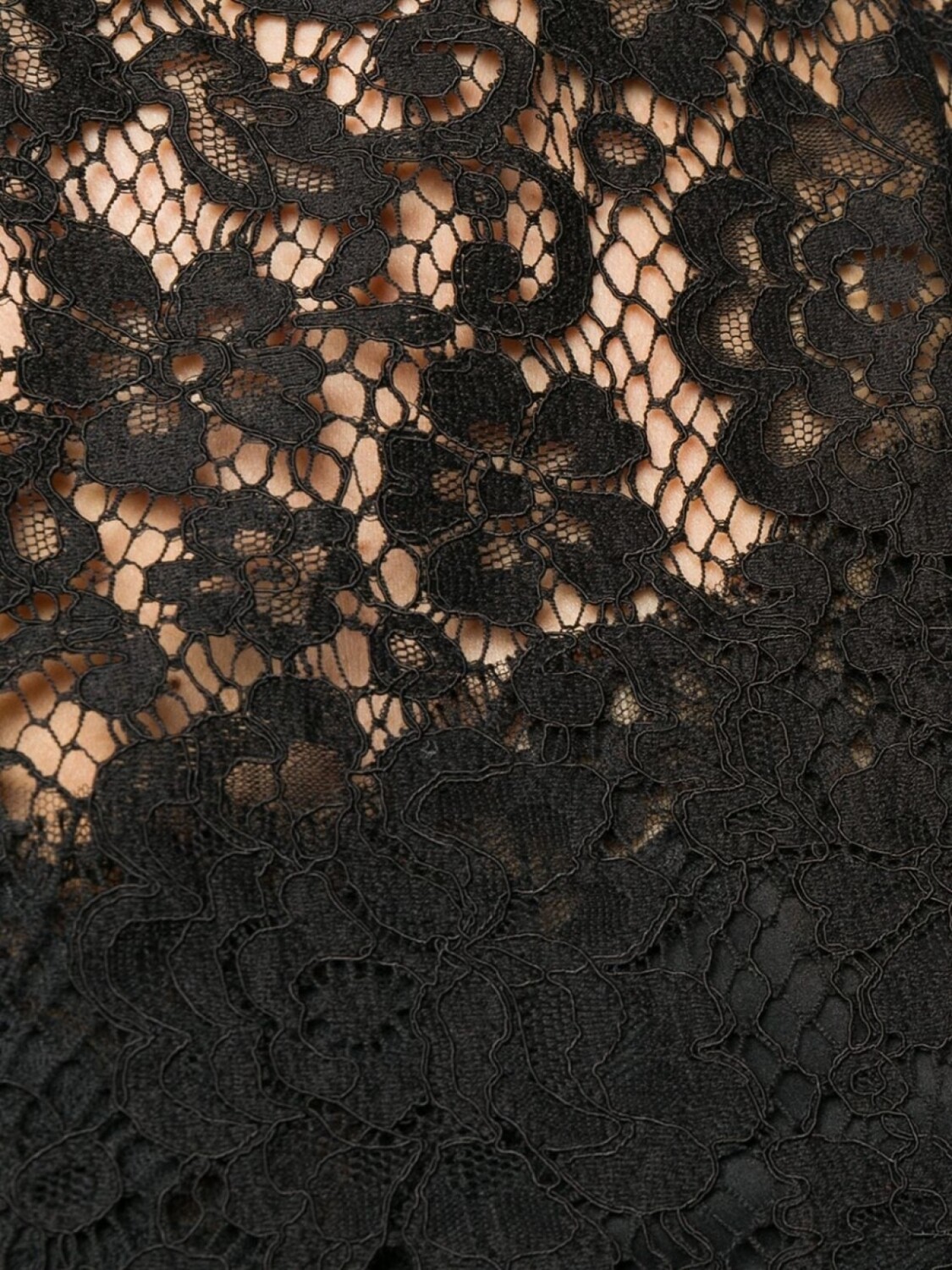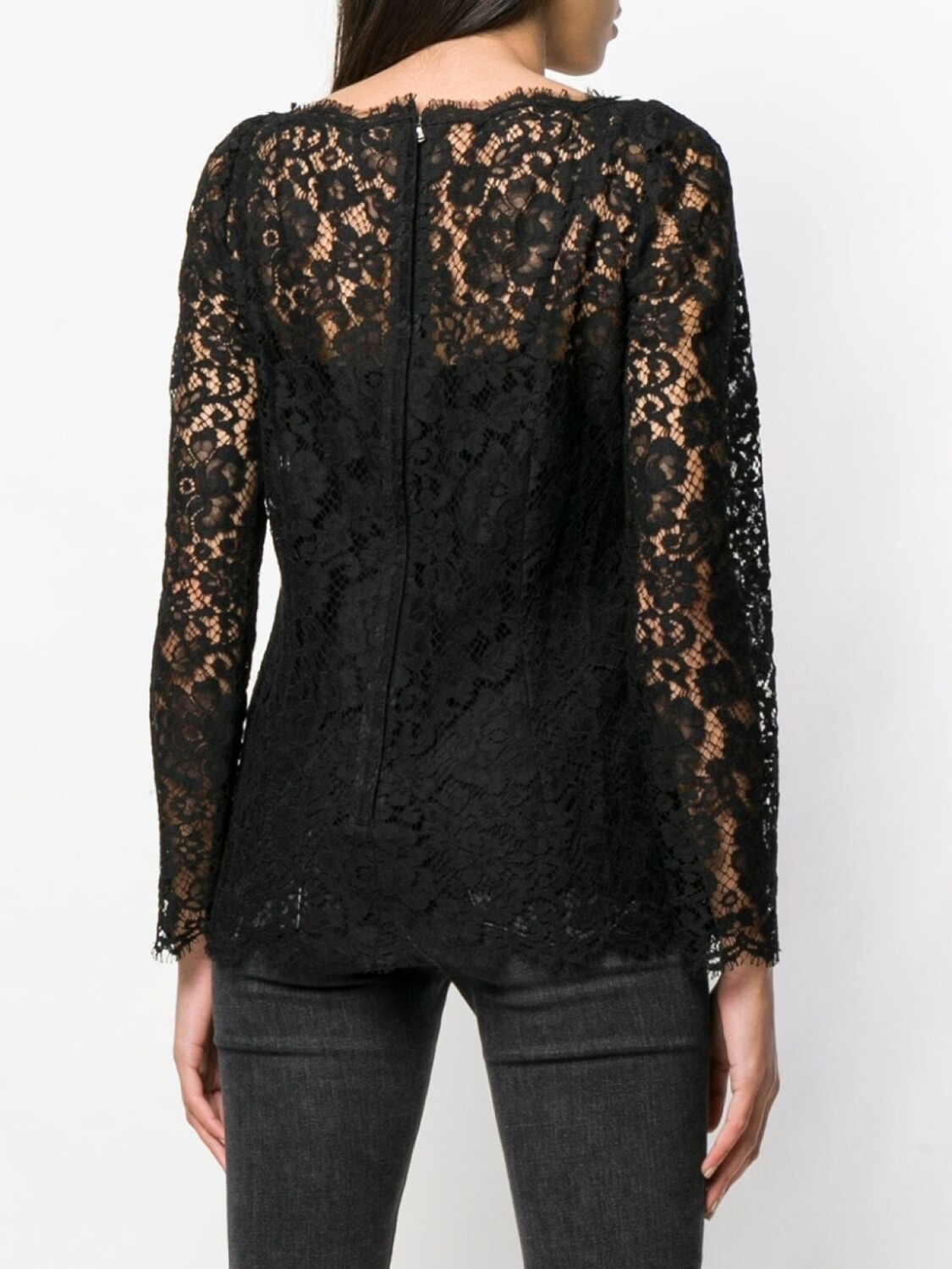 Колоритный декор, цветочные узоры и тонкое кружево стали отличительными символами современных коллекций итальянского дома моды Dolce & Gabbana. Среди моделей — черная кружевная блузка из микса хлопка и шелка с длинными рукавами от Dolce & Gabbana (Дольче энд Габбана). Вырез-лодочка, длинные рукава, прозрачные вставки, застежка на молнии сзади, узкий крой и кружевной подол с фестонами.