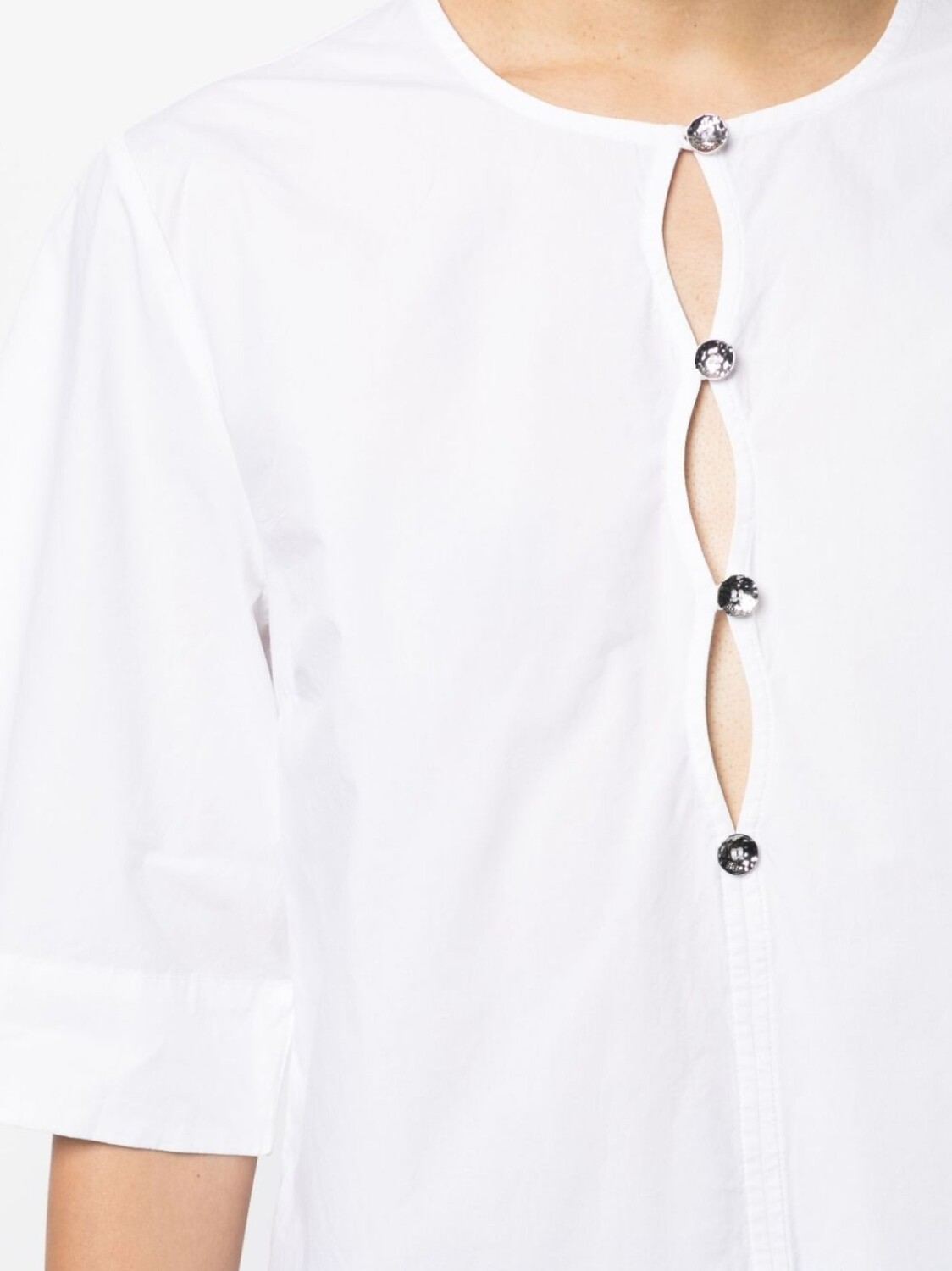 Белый, органический хлопок, круглый вырез, вырезные детали, короткая застежка на пуговицах спереди, короткие рукава и прямой подол. Этот товар как минимум на 50% состоит из органических материалов. Узнать больше о том, какие товары получают отметку «Ответственный выбор», можно из материала «Как мы оцениваем экологичность и этичность».