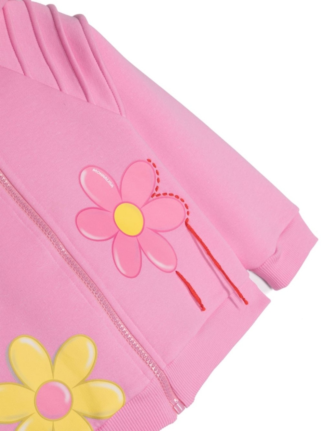 Ярко-розовый, хлопок, ткань джерси, цветочный принт спереди, контрастная строчка спереди, отделка кантом на плечах, классический капюшон, застежка на молнии спереди, рукава реглан, подол и манжеты в рубчик, прямой подол, флисовая подкладка