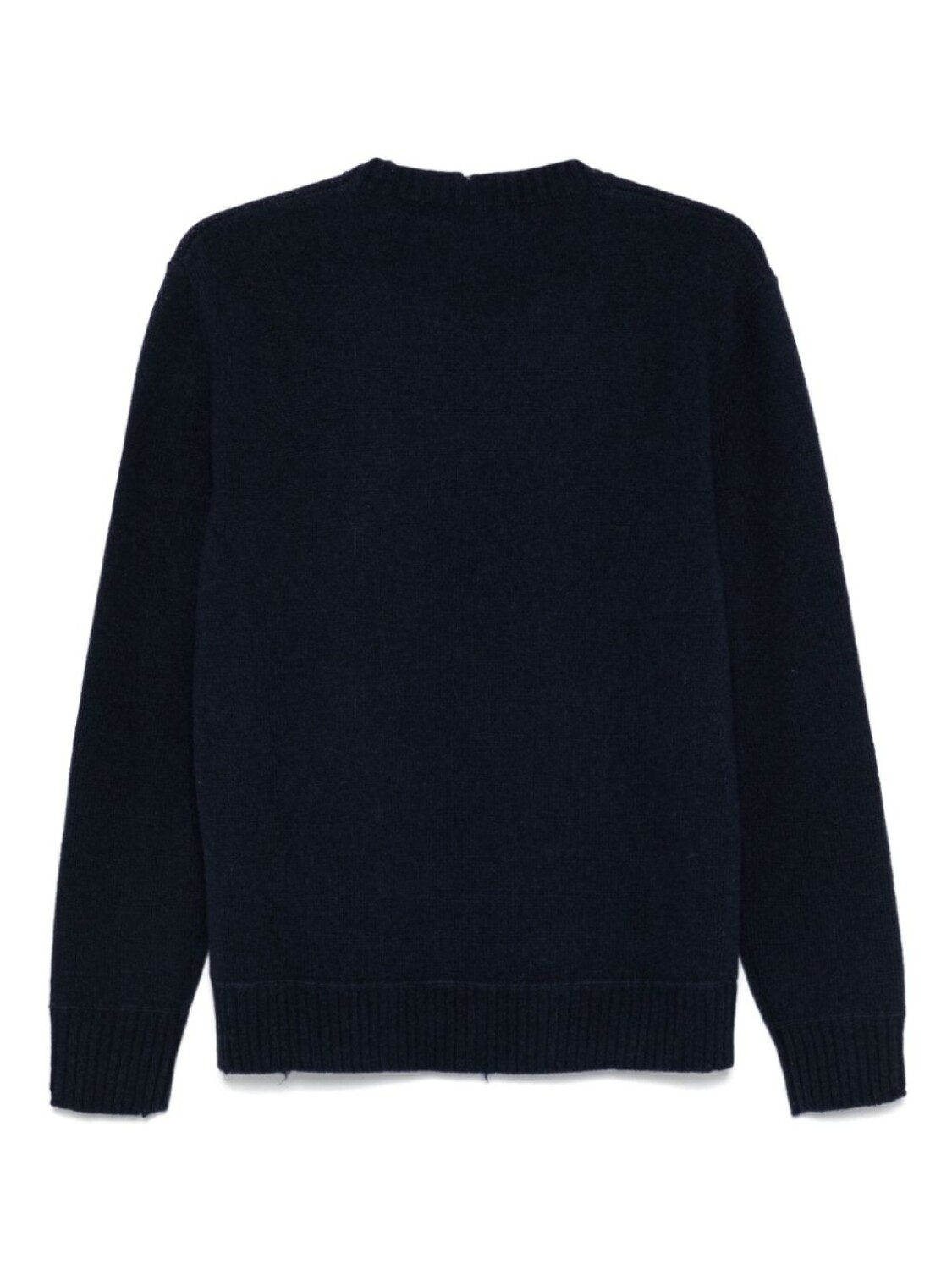 Смесь шерсти и кашемира имперского синего цвета, ребристый трикотаж с эффектом начеса, передний карман-кенгуру, круглый вырез горловины, длинные рукава, серебристая бляшка с логотипом, прямой подол