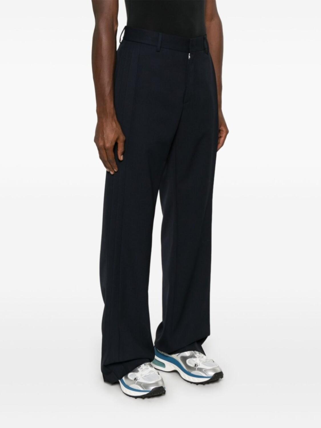 Темно-синяя ткань саржевого переплетения интерлок, потайная застежка спереди, шлевки для ремня, складки посередине посадки, два прорезных кармана по бокам, два прорезных кармана сзади, прямой штанин