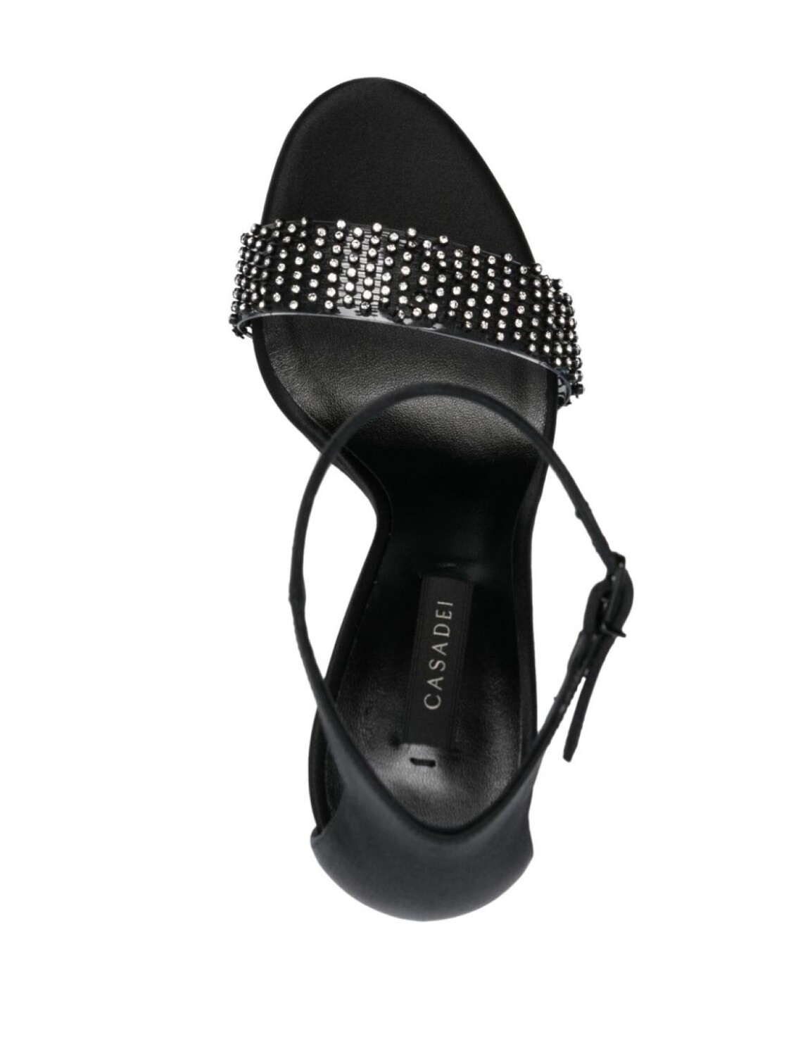 Черный, телячья кожа, сатиновая фактура, украшения из горного хрусталя, кожаная стелька с логотипом, открытый носок, ремешок на палец, ремешок на щиколотке с пряжкой и каблук на высокой шпильке.