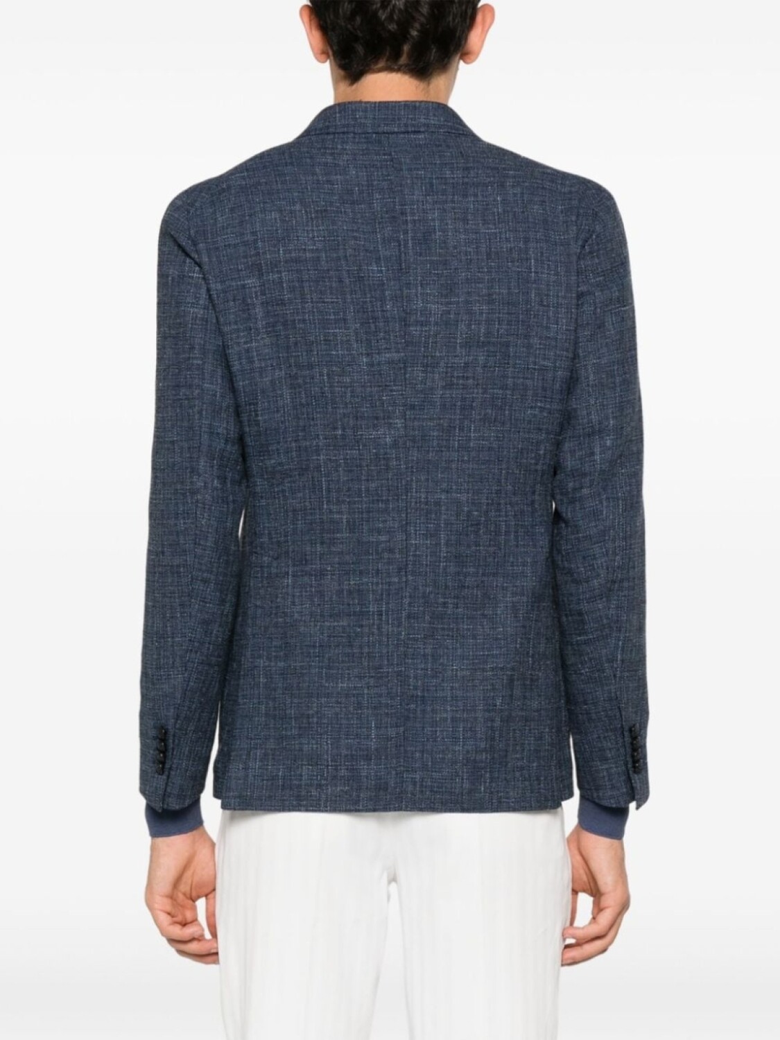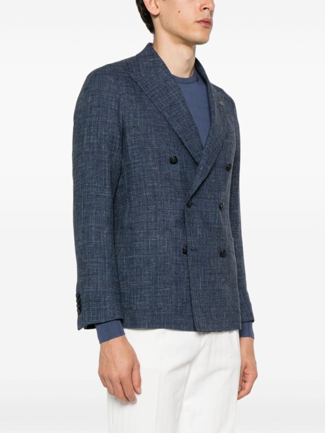 Темно-синий, твидовая ткань, декоративная брошь, заостренные лацканы, двубортная застежка на пуговицы, длинные рукава, манжеты на пуговицах, прорезной карман на груди, два накладных кармана спереди, две боковые шлицы сзади, прямой подол, частичная подкладка