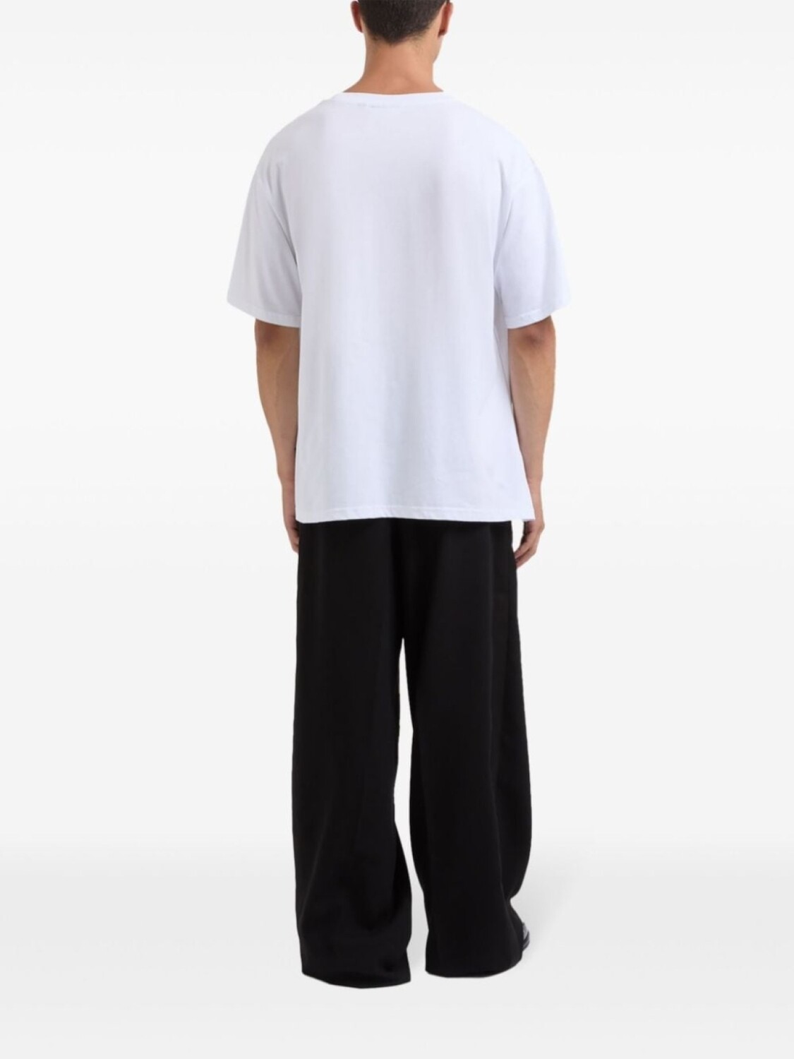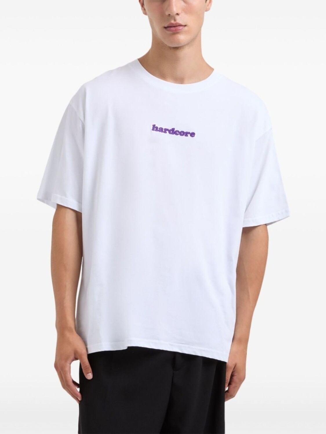 Белый хлопковый легкий трикотаж вышитый логотип спереди круглый вырез горловины короткие рукава прямой подол