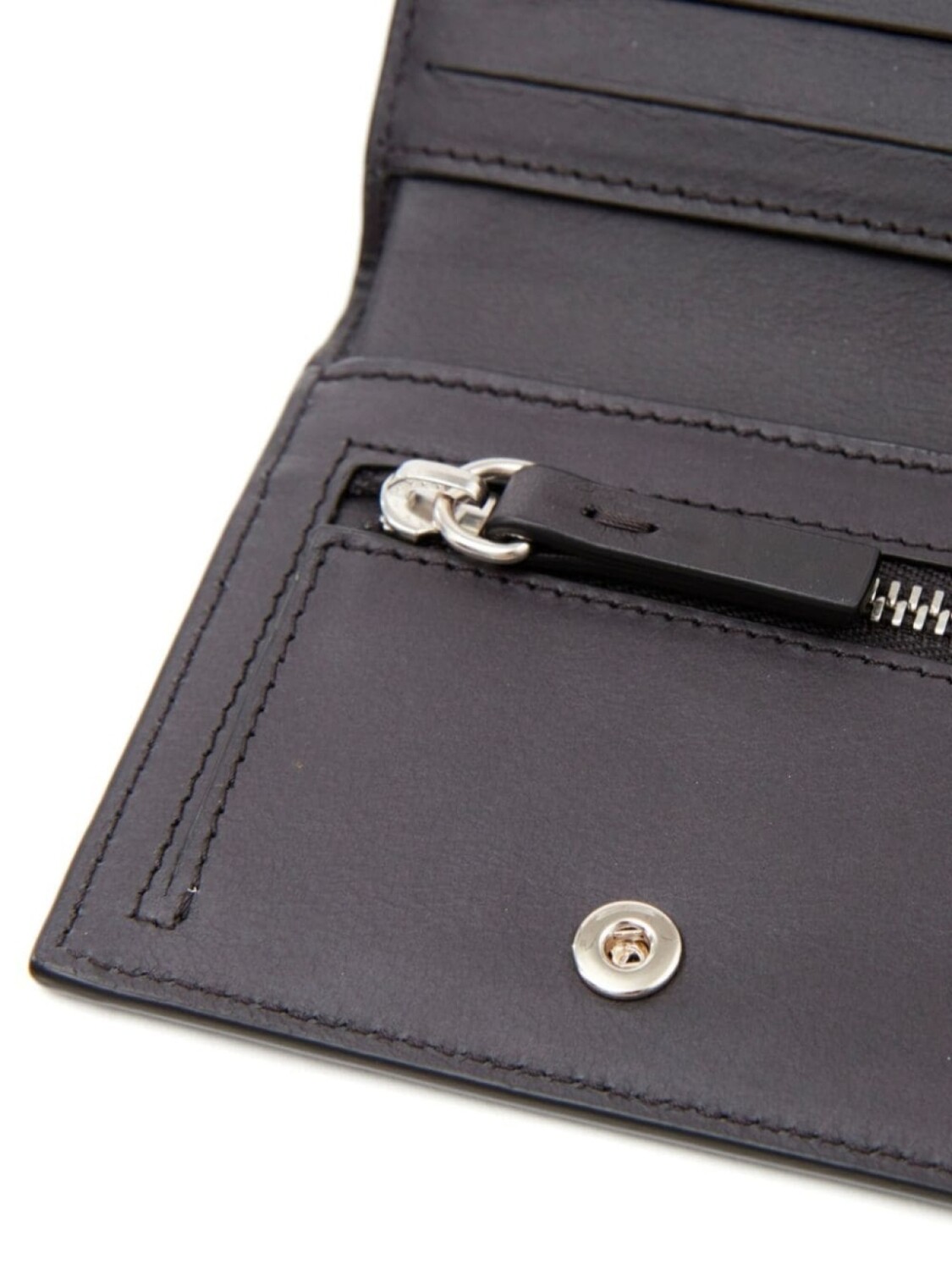 Черный, телячья кожа, смягчающее покрытие, знаковый узор с цифрами, знаковый логотип-стежок, два сложения, застежка на кнопке, внутренний карман на молнии
