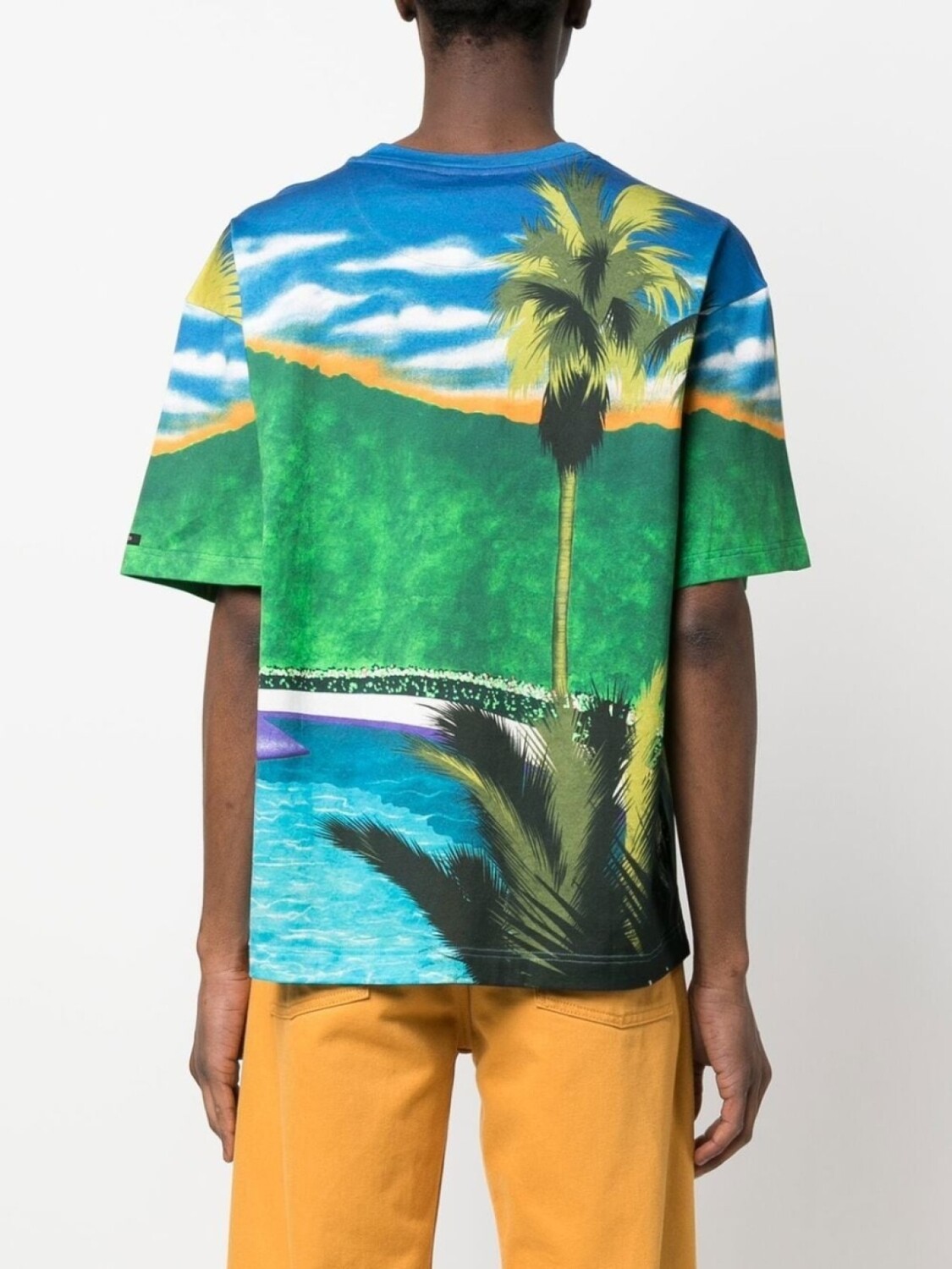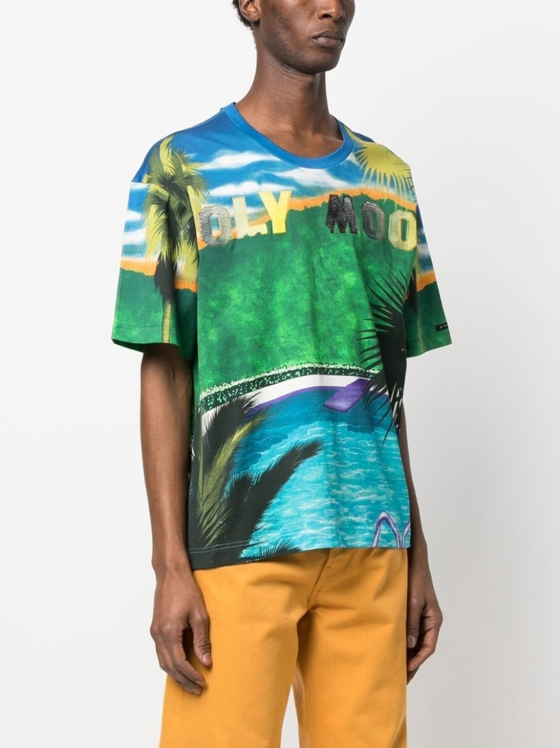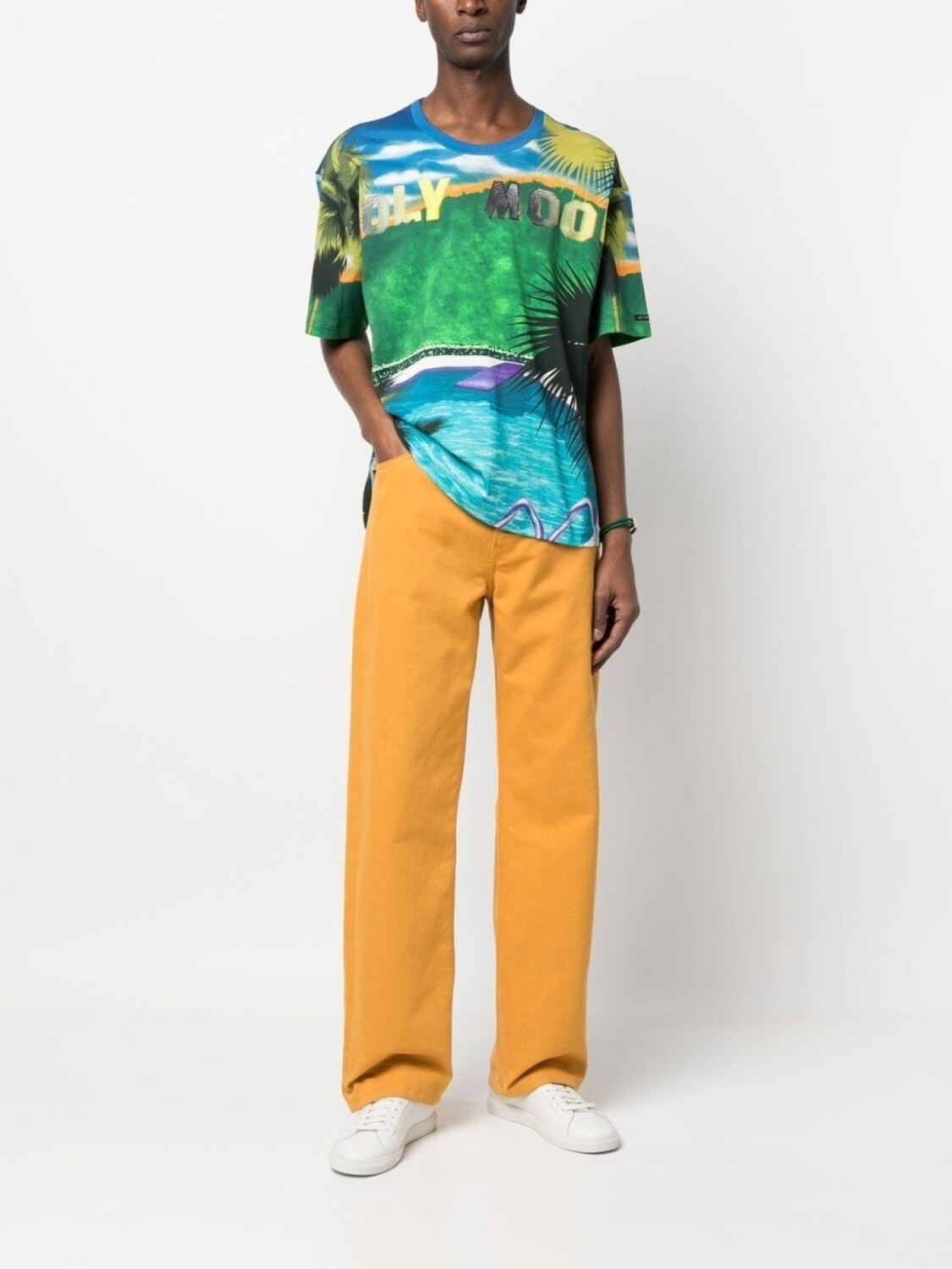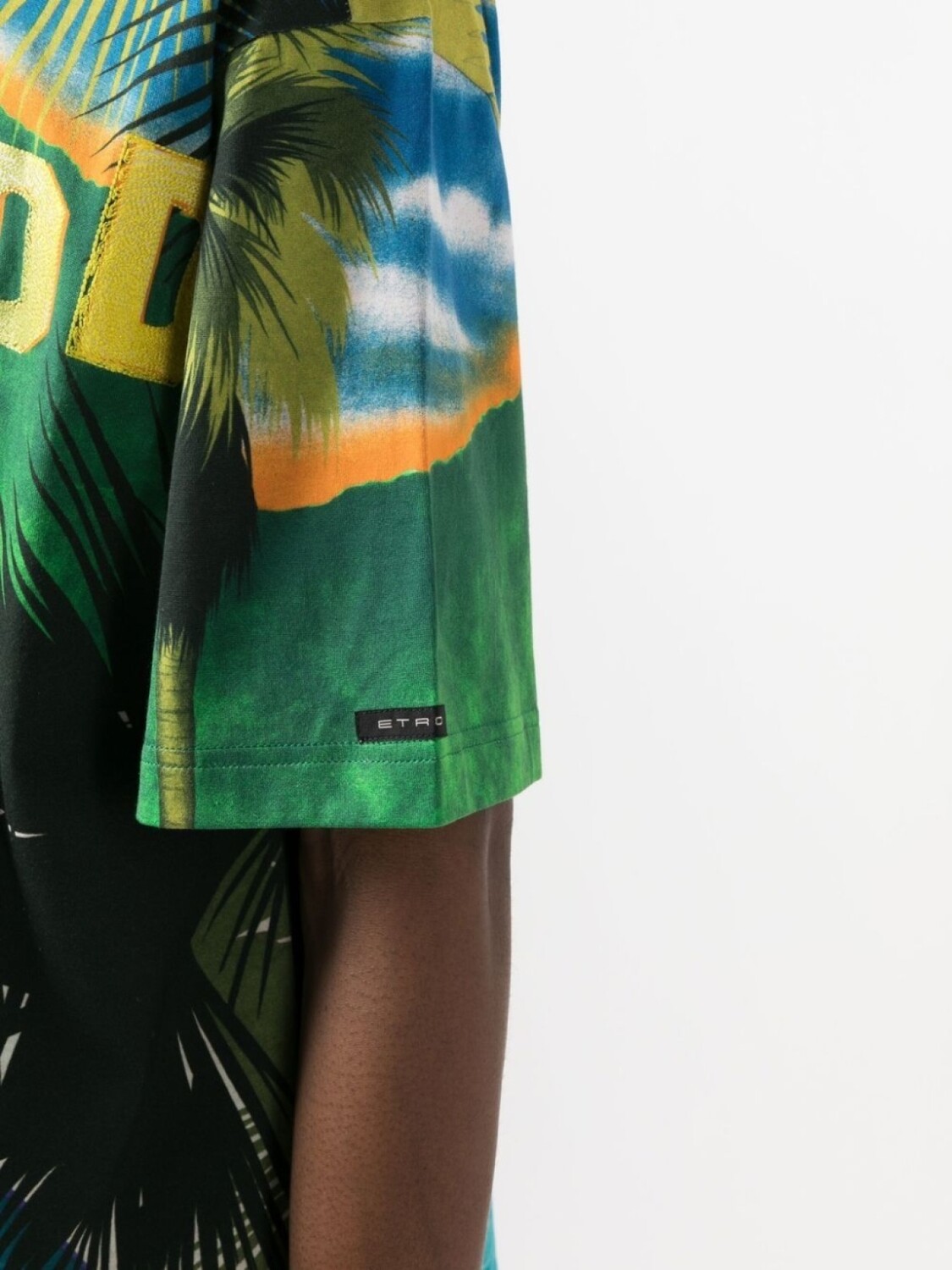 Ткань джерси, сплошной графичный принт, нашивка с логотипом на рукаве, круглый вырез, короткие рукава и прямой подол.