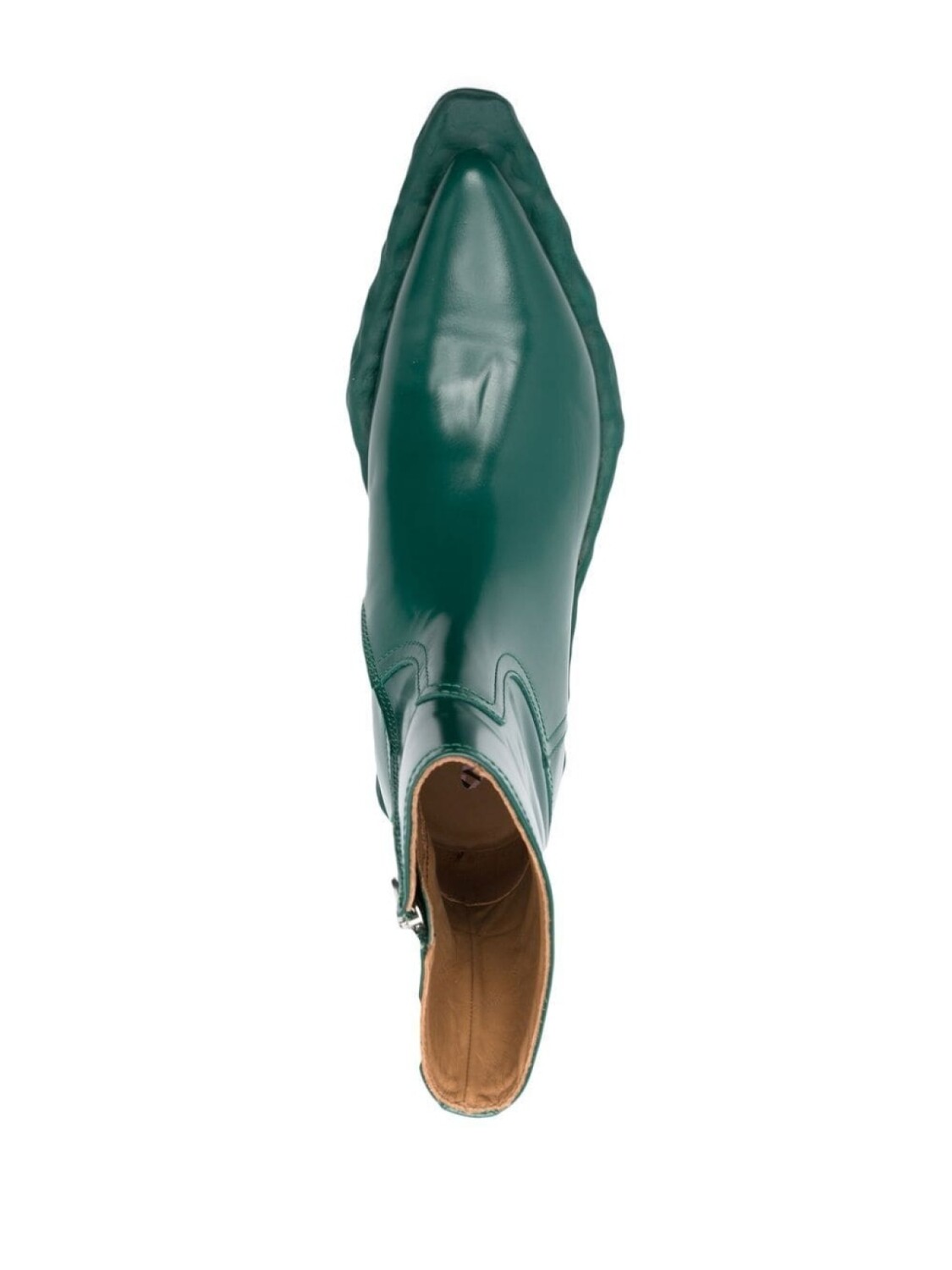 Темно-зеленый, кожа, заостренный носок, застежки на молнии сбоку и низкий блочный каблук.