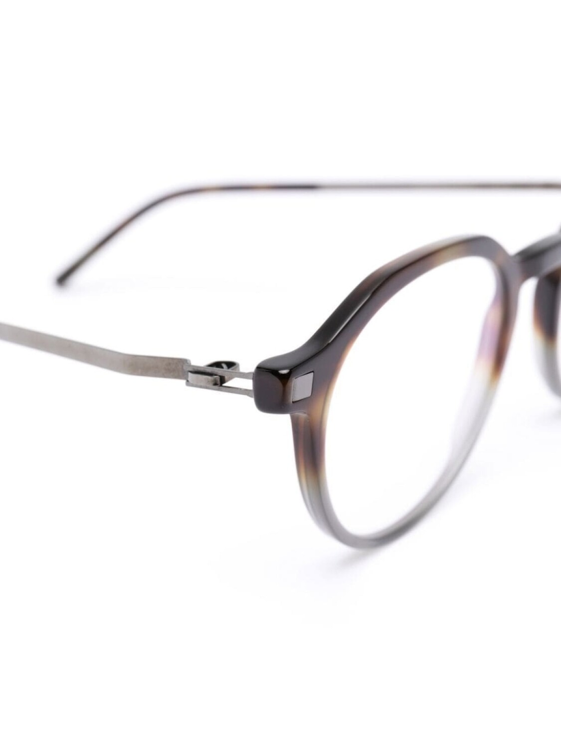 Коричневый, круглая оправа, прозрачные линзы, прямые дужки и дужки с закругленными концами. Обратите внимание, что на FARFETCH продаются оправы с линзами без диоптрий.