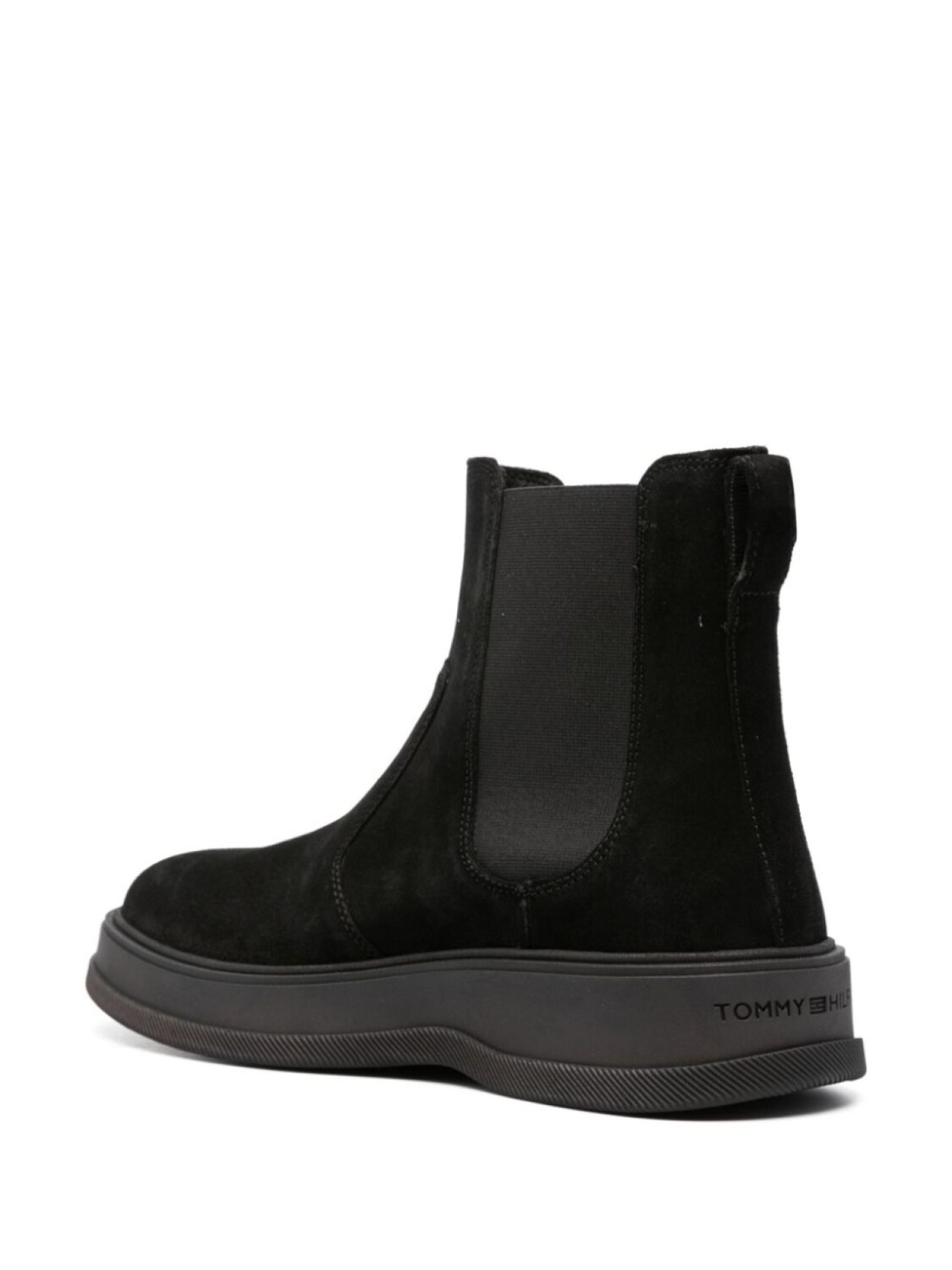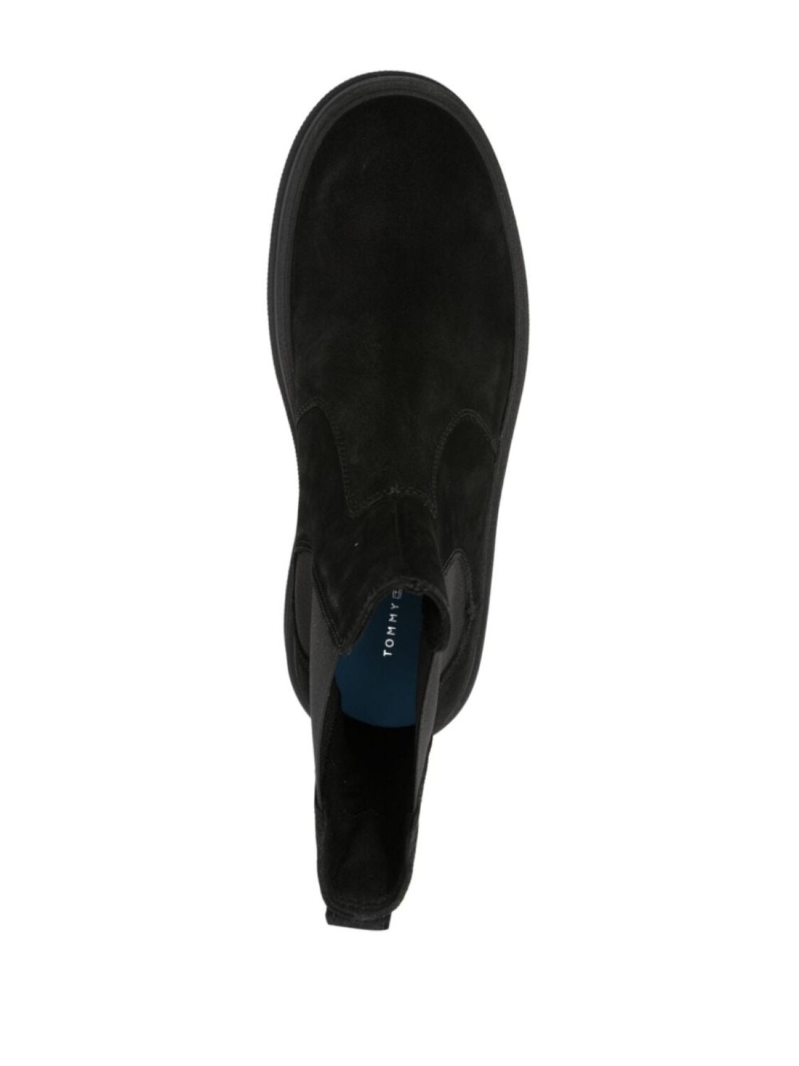 Черный, замша из телячьей кожи, вставки, маленькая подвеска с логотипом, тисненый логотип сзади, закругленный носок, высота по щиколотку, эластичные боковые вставки, петля для подтягивания с логотипом, стелька с логотипом и плоская резиновая подошва.