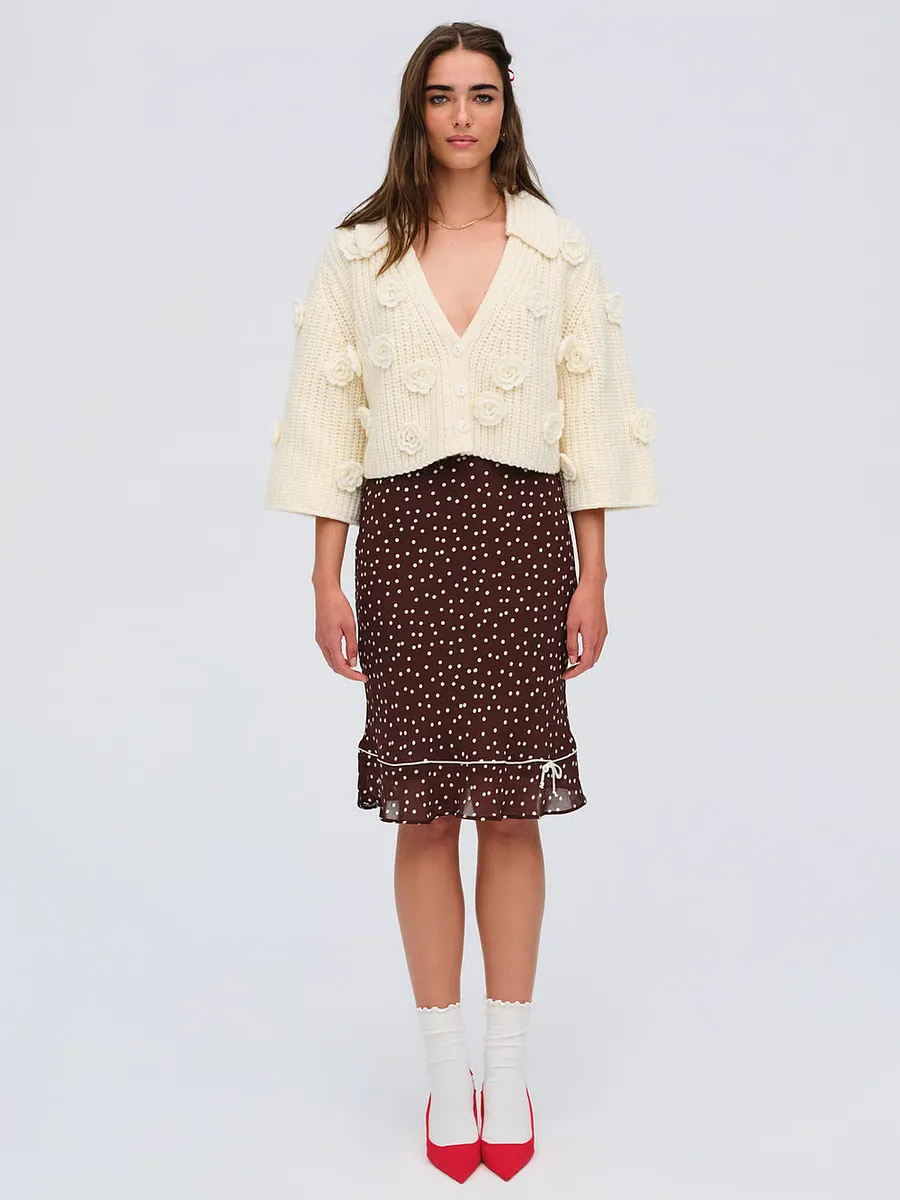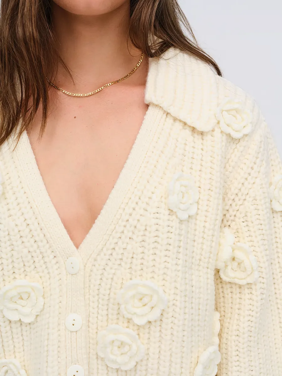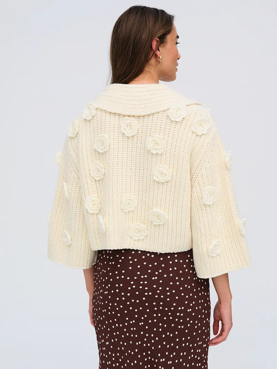 Никогда еще свитер не выглядел так приятно, как этот объемный кардиган, украшенный декоративными объемными цветами и рукавами длиной три четверти.