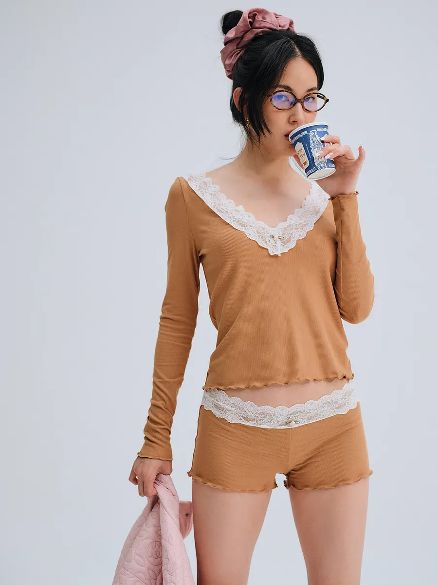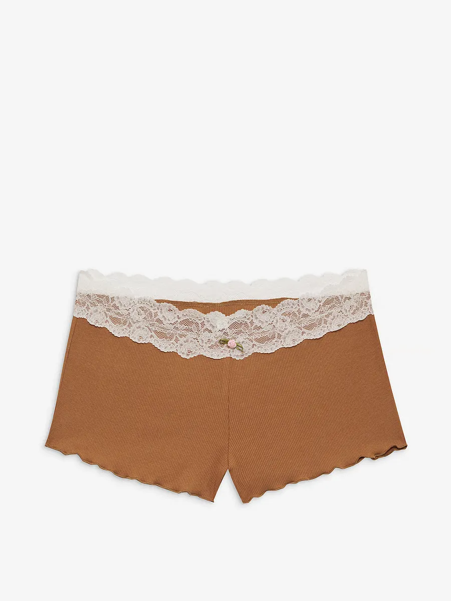 Эти шорты для отдыха имеют кружевную отделку на поясе, украшенную небольшой розеткой, а также салатовую отделку на штанинах. Сочетайте его с трикотажным топом в рубчик Eisley, чтобы создать уютный образ.
