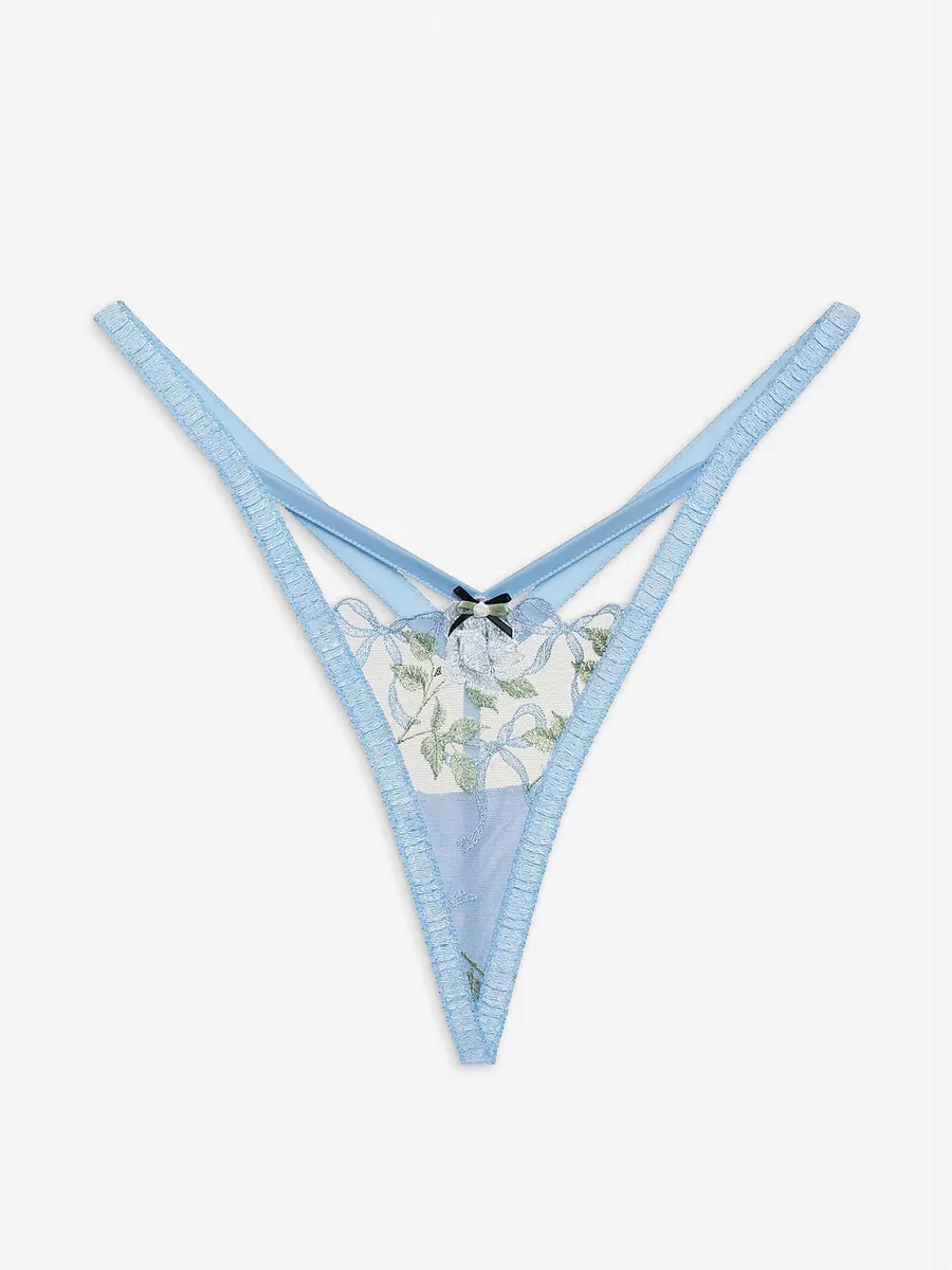 Эти синие стринги-стринги, созданные для кокетливых женщин, украшены элегантной вышивкой в виде розы и банта, а также атласным бантом-розеткой спереди.