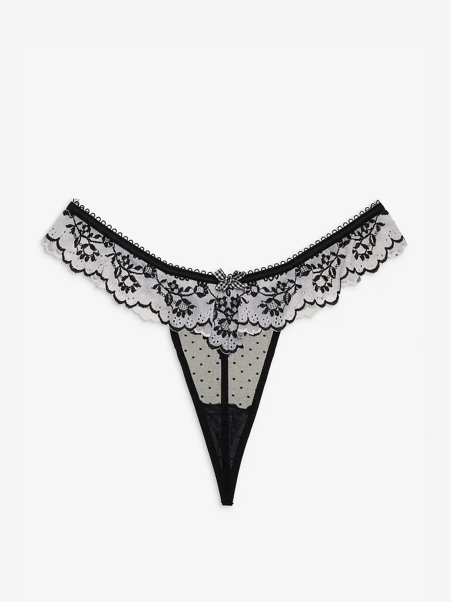 Эти стринги, вдохновленные знойным французским нижним бельем, выполнены из точечной сетки с вышитыми оборками на бедрах и бантиком в мелкую клетку. Носите его в комплекте с подходящим бралеттом Rubee Bralette.