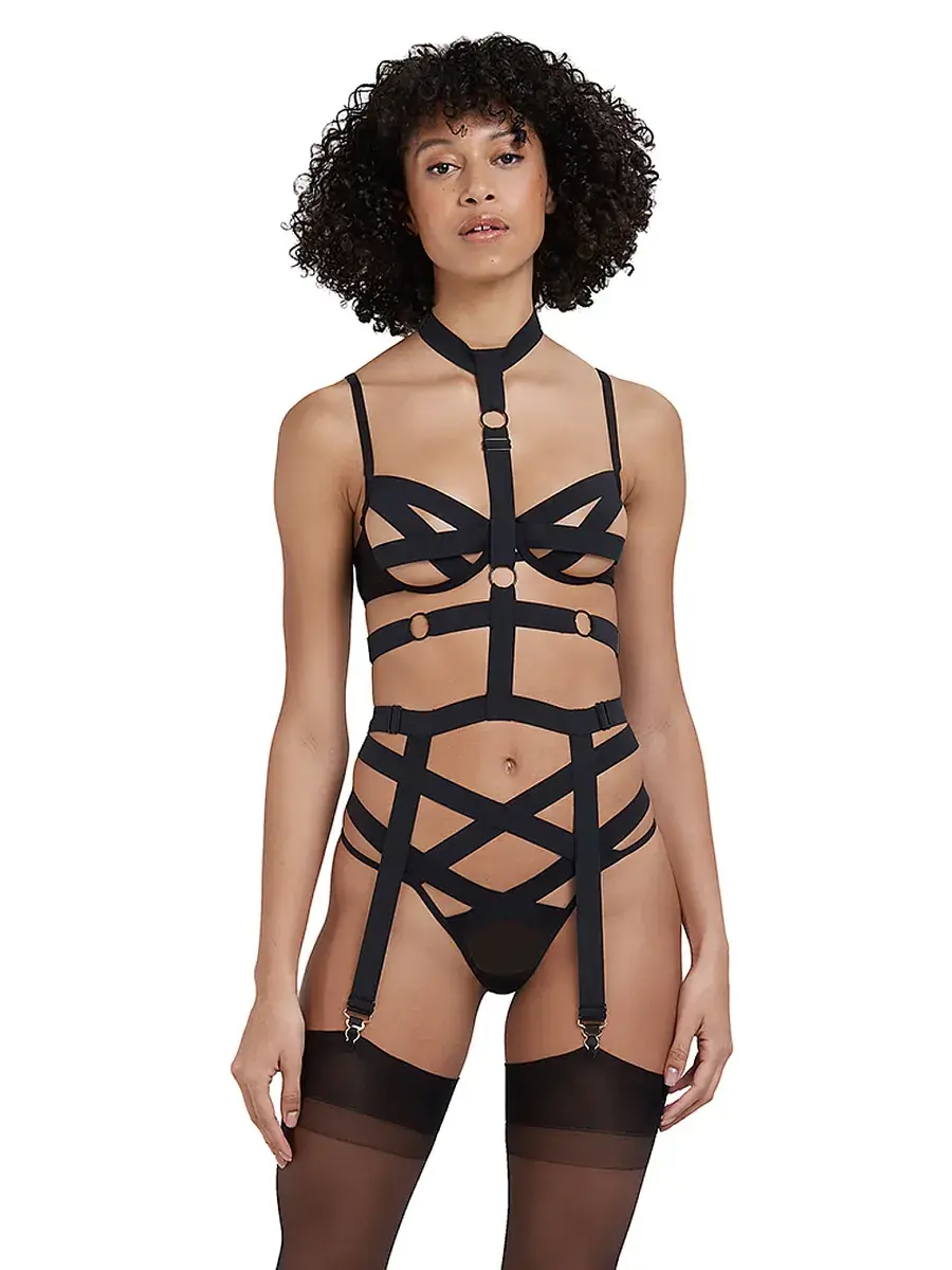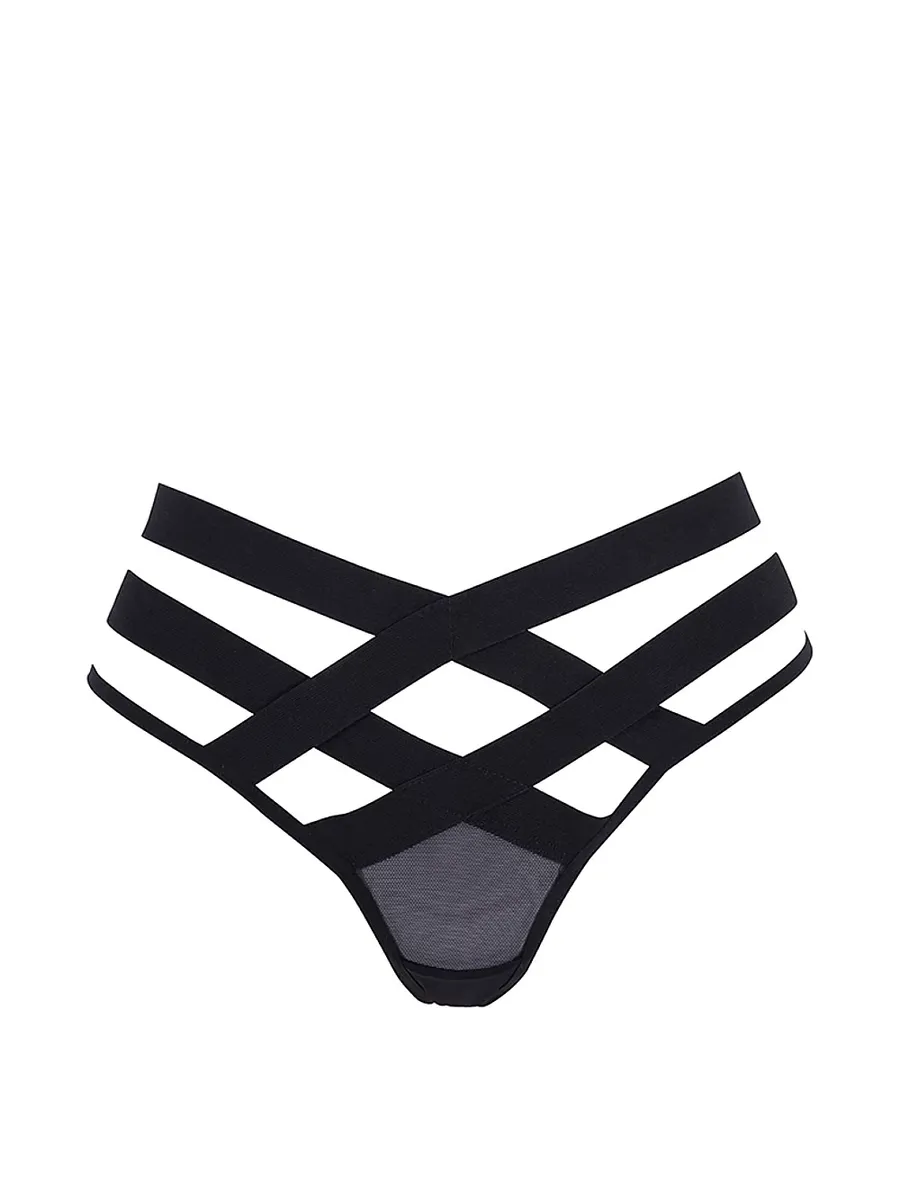 Эта провокационная модель с ремешками обязательна в любом современном гардеробе нижнего белья. Широкие эластичные ленты создают силуэт с высокой талией и вырезами, а тонкие вставки из прозрачной сетки создают текстурный контраст.