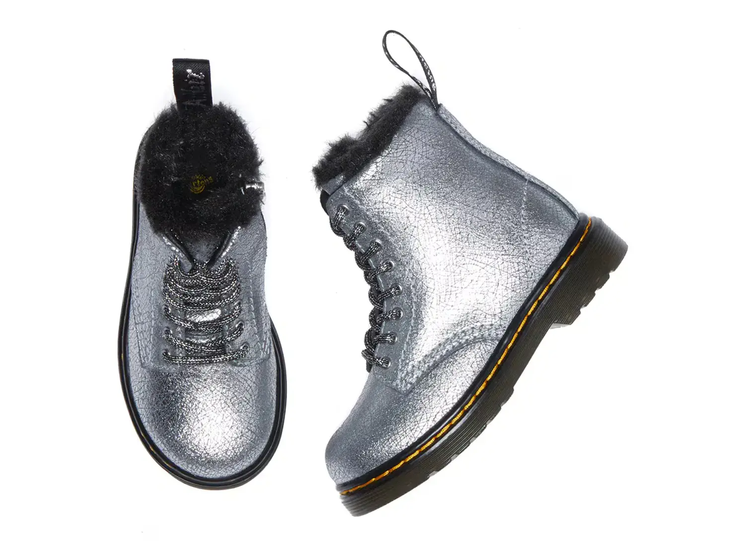 Подарите своему малышу современное преимущество в армейских ботинках 1460 от Dr. Martens. Эти кожаные туфли на шнуровке имеют культовый силуэт, придающий ее стилю нотку гранжа. Модель имеет слегка потертый металлический оттенок, создающий идеальный поношенный вид, и подкладку из искусственного меха, создающую уют.