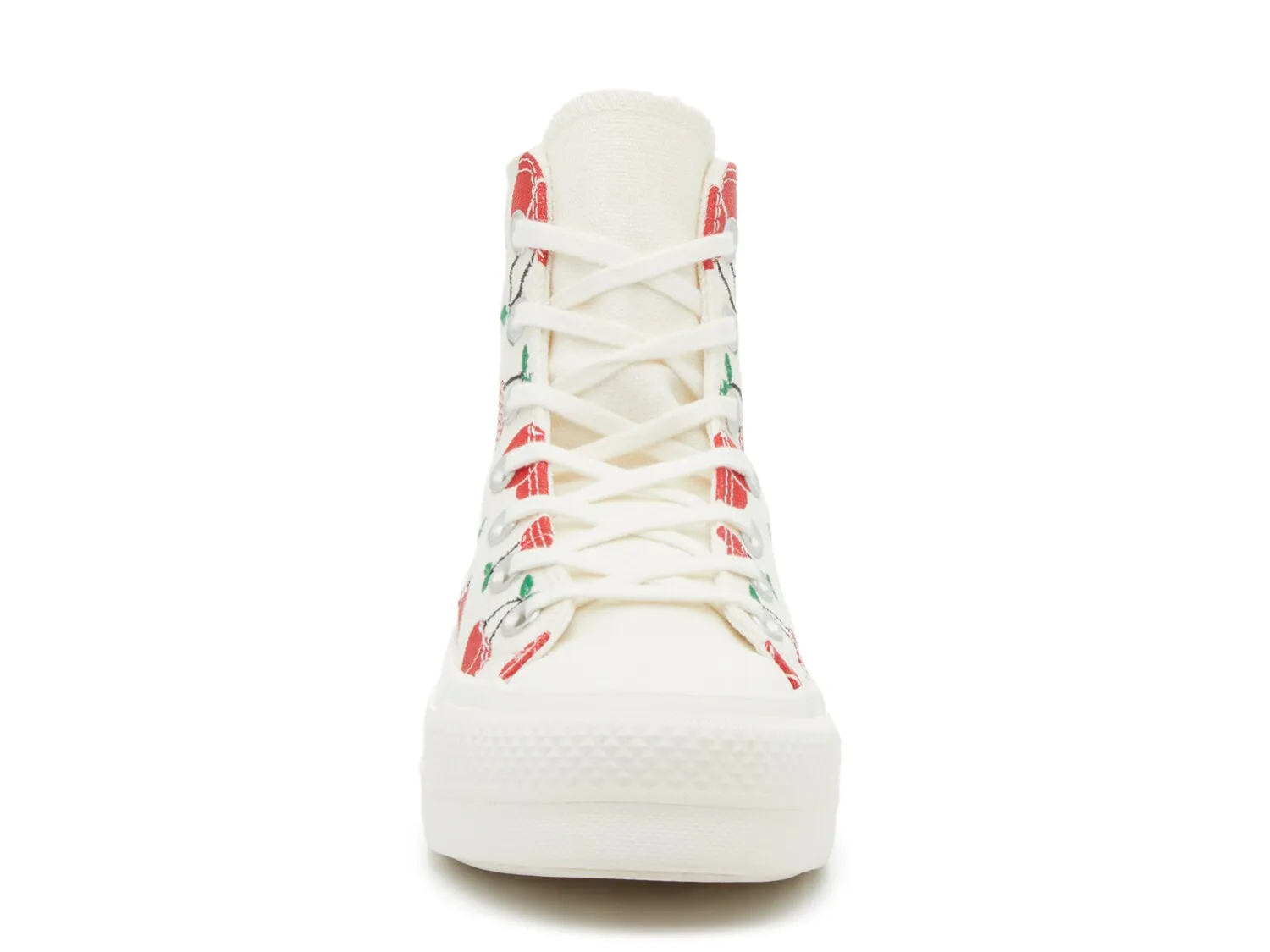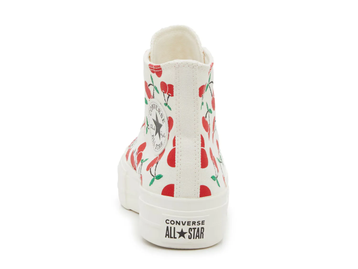 Повседневные образы получили модное обновление с кроссовками на платформе Chuck Taylor All Star от Converse. Эти высокие кроссовки классического силуэта с игривым вишневым принтом и плоской межподошвой подойдут к любому наряду.