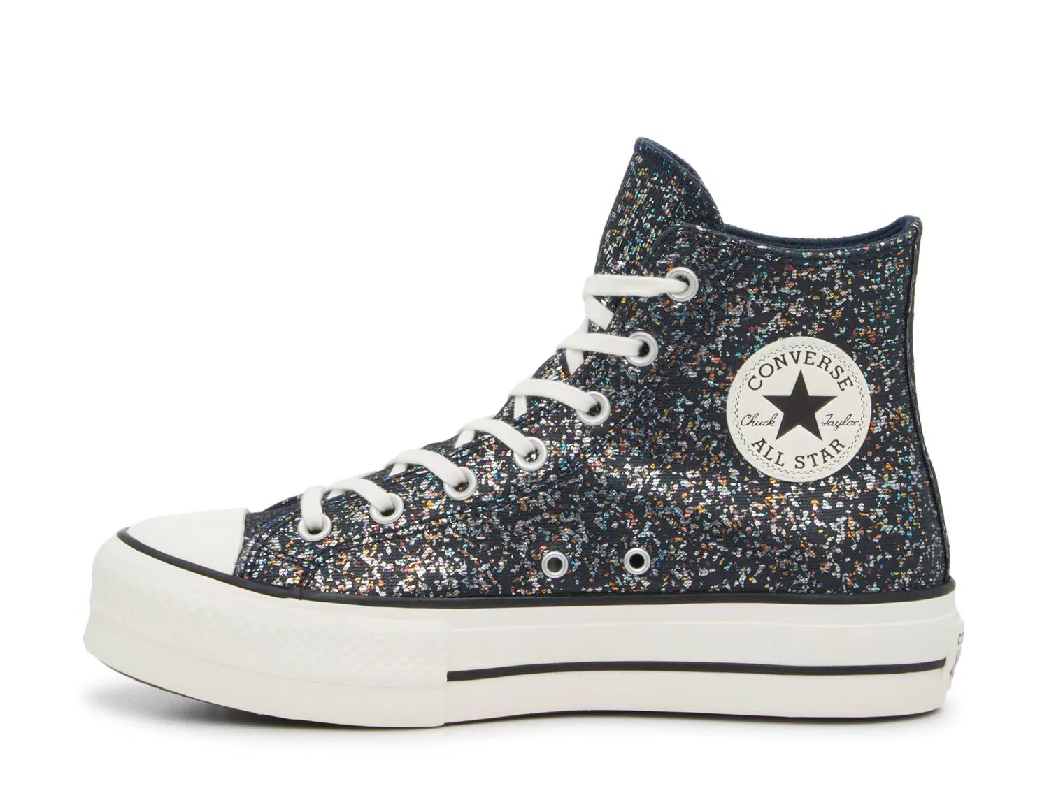 Повседневные образы получили модное обновление с кроссовками на платформе Chuck Taylor All Star от Converse. Эти высокие туфли классического черного цвета украшены разноцветными конфетти, создающими игривый эффект. В комплекте с платформой, подчеркивающей спортивный стиль.