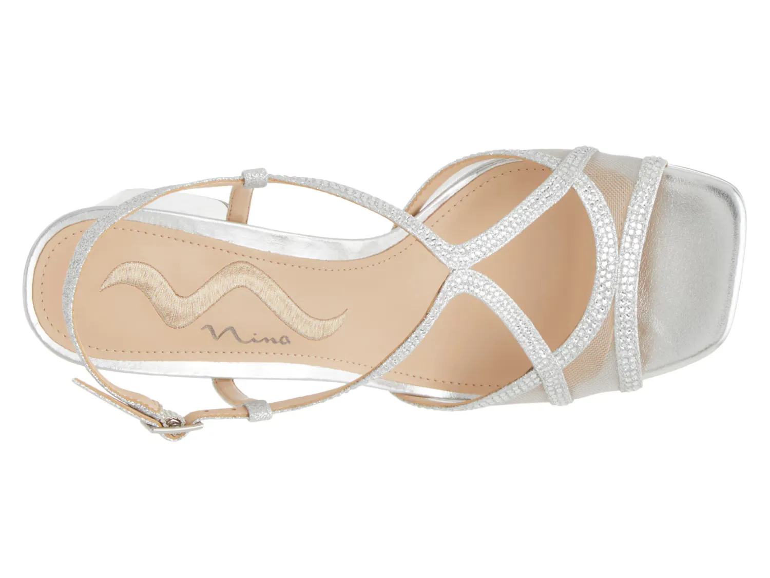 Блестящие и сияющие сандалии Stormi от Nina. Силуэт с ремешками и дизайн платформы подчеркнуты сверкающими стразами и модным серебристым оттенком.