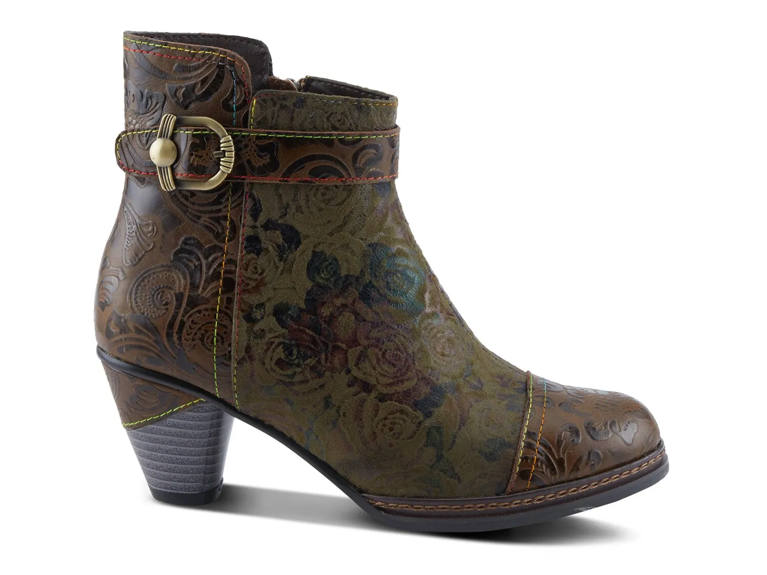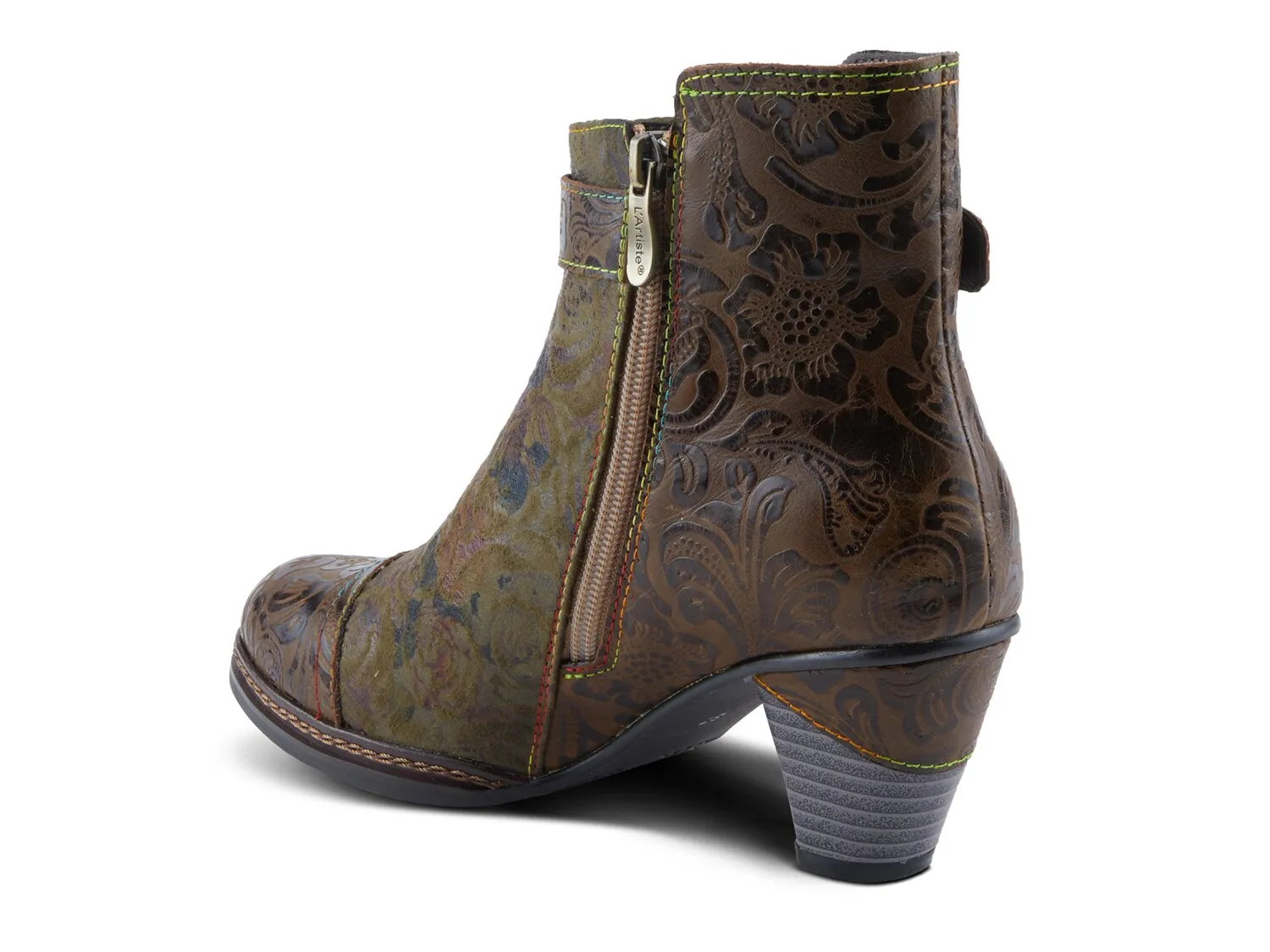 Бохо-ботинки Antilles от L'Artiste впечатлят бохо-шиком. Цветочные принты и тиснение придают художественный вид этим ботильонам с закрытым носком, дополненным классической пряжкой для ремня. Низкий, частично наборный и частично завернутый каблук делает эту модель идеальной для работы или повседневных приключений.