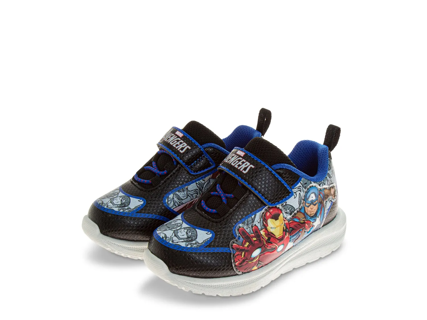 Ваш маленький герой собирается для игры в светящихся кроссовках Marvel Avengers от Disney. В этой паре изображены их любимые герои, а мягкие детали и резиновая подошва обеспечивают поддержку.
