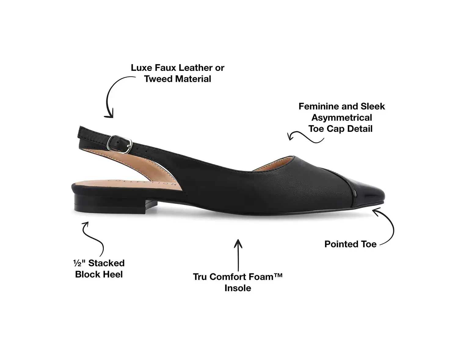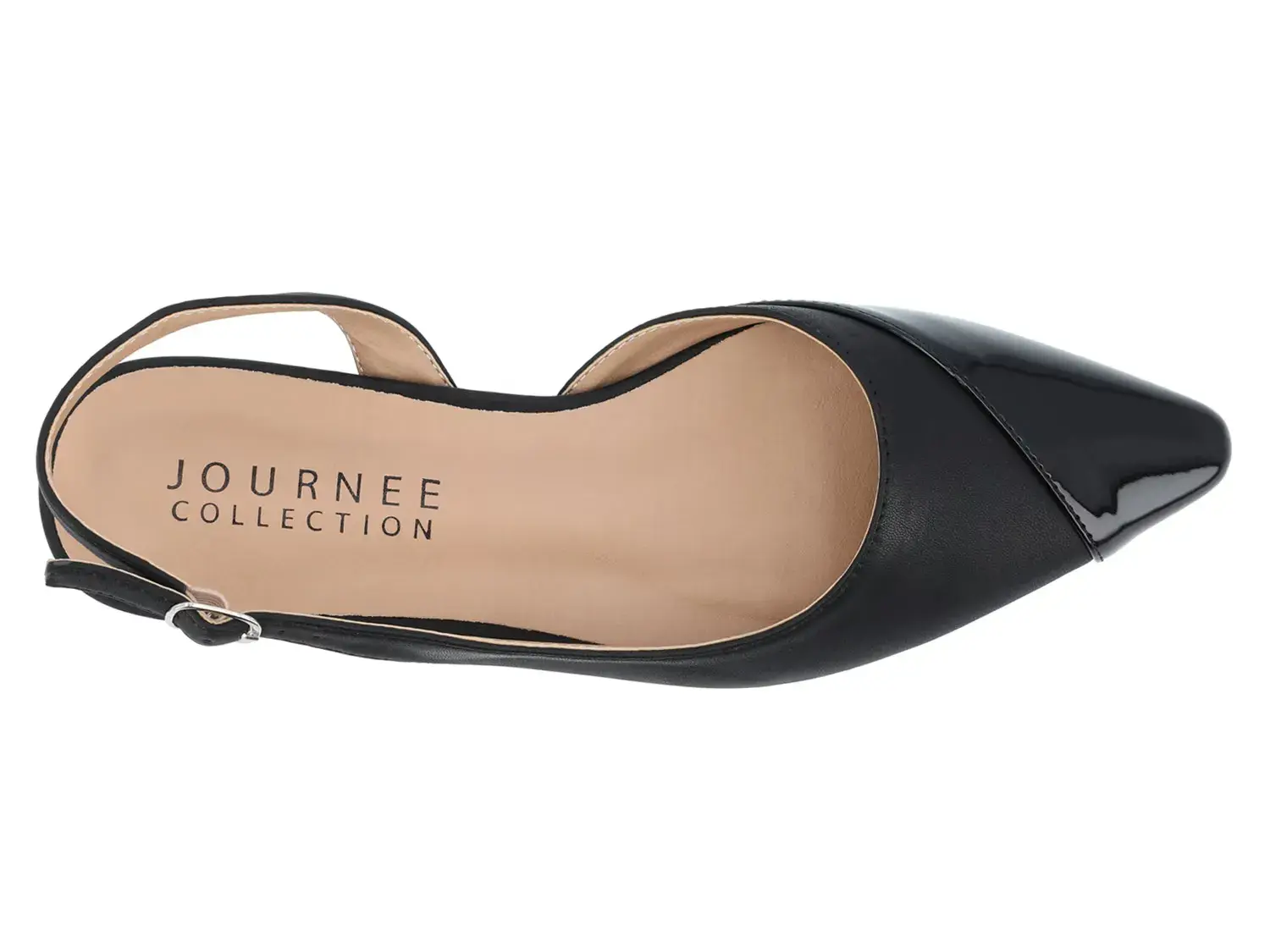 Если вам нравится элегантный стиль, обратите внимание на балетки Daphnne от Journee Collection. Регулируемая обувь на плоской подошве дополнена асимметричным лакированным мыском, который выглядит изысканно. Тонкий наборный каблук дополняет изящный профиль.