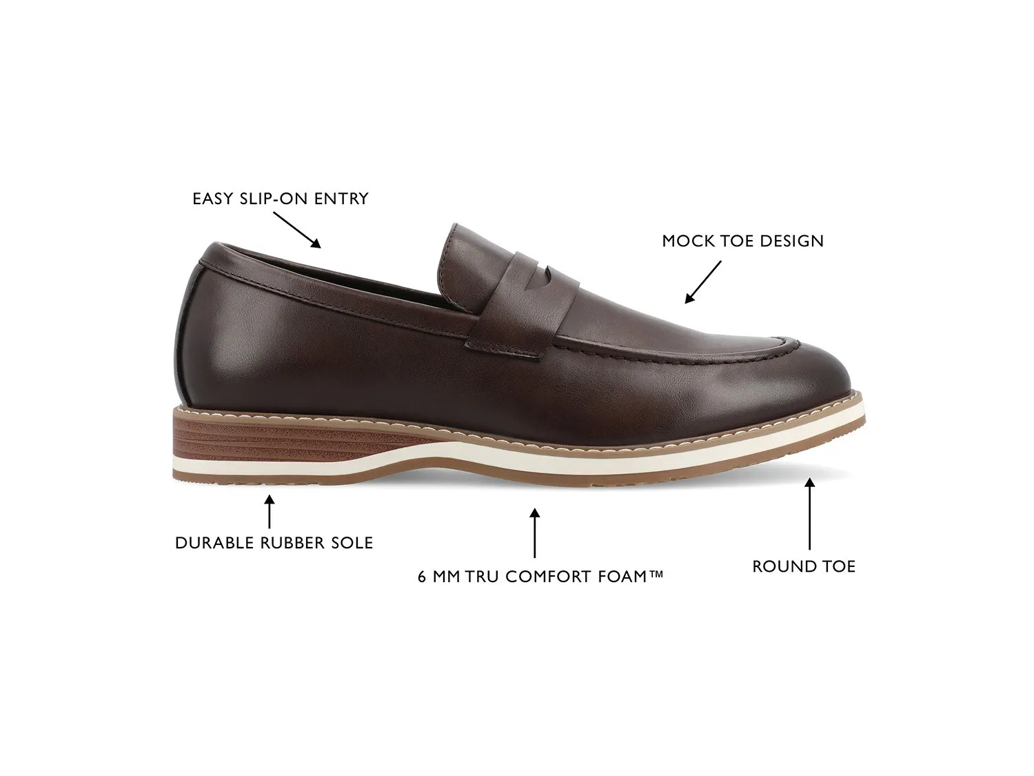 Завершите свой аккуратный и стильный образ этими пенни-лоферами Kahlil от Vance Co. Эти слипоны имеют долговечный веганский синтетический верх, стельку из пеноматериала Tru Comfort и дышащую подкладку, обеспечивающую комфорт вашей ноге. Благодаря резиновой подошве с рисунком эти лоферы позволяют ходить с максимальной уверенностью.