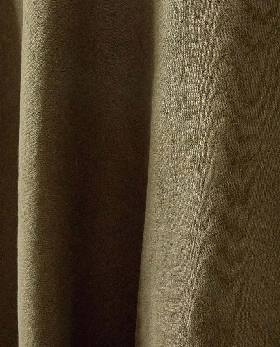 Круглая скатерть диаметром 270 см из стираного европейского льна ниспадает определенным образом, создавая эффект занавески. Он дополнен мягкой строчкой, сохраняющей первоначальный внешний вид льна.