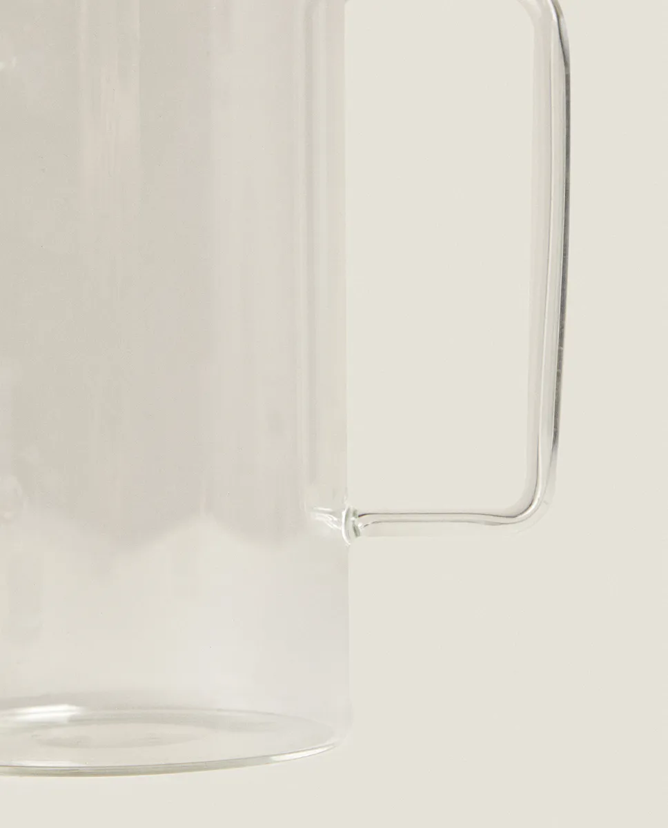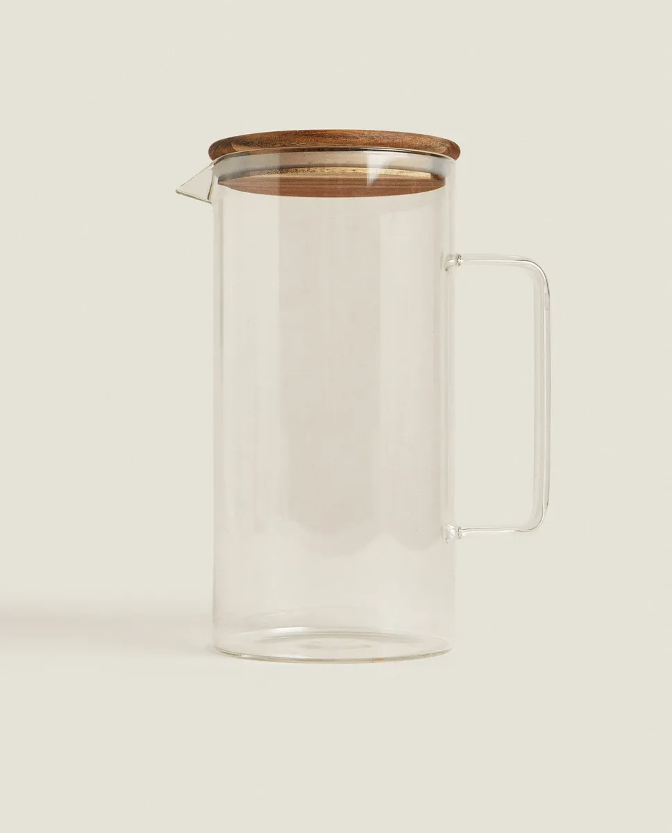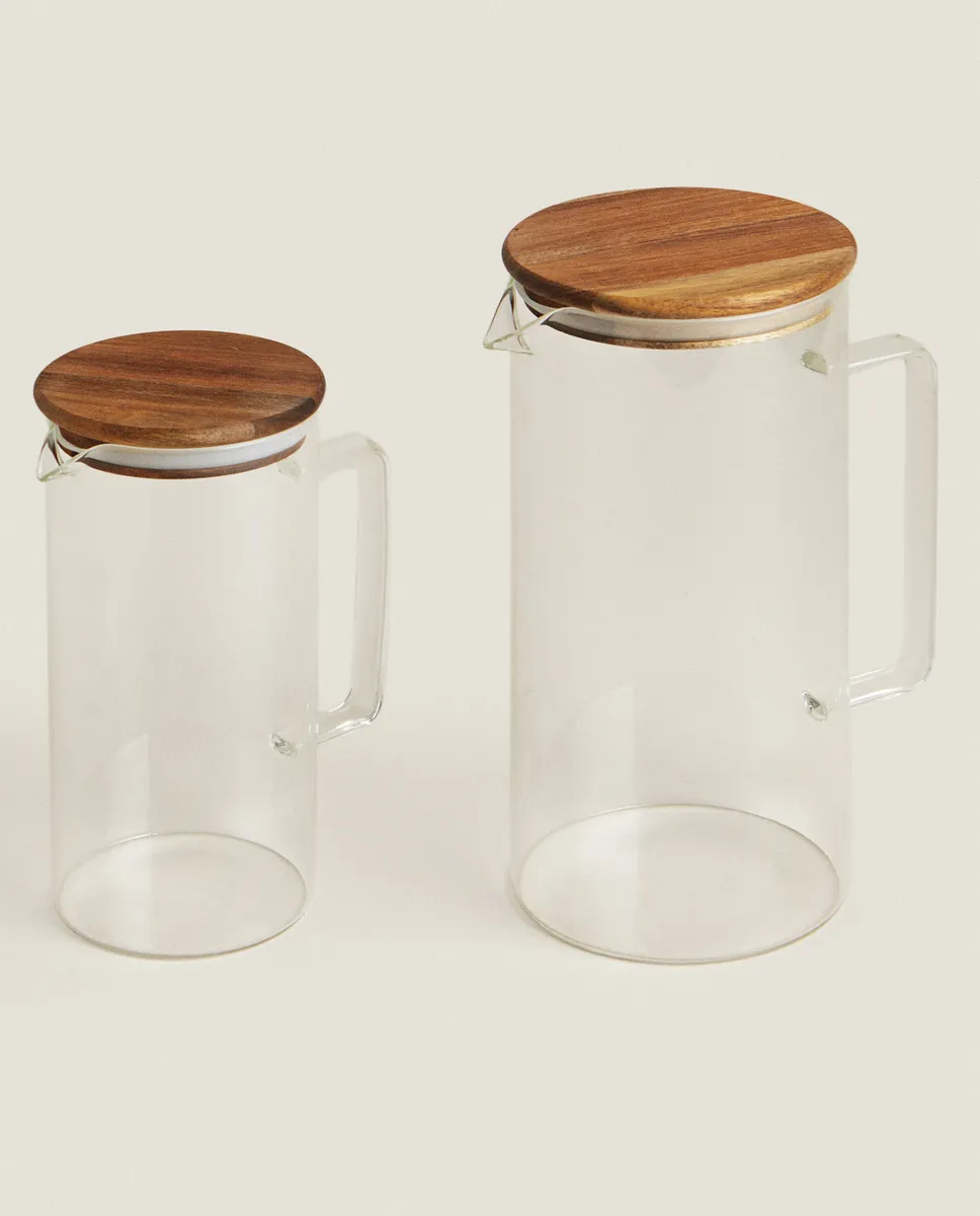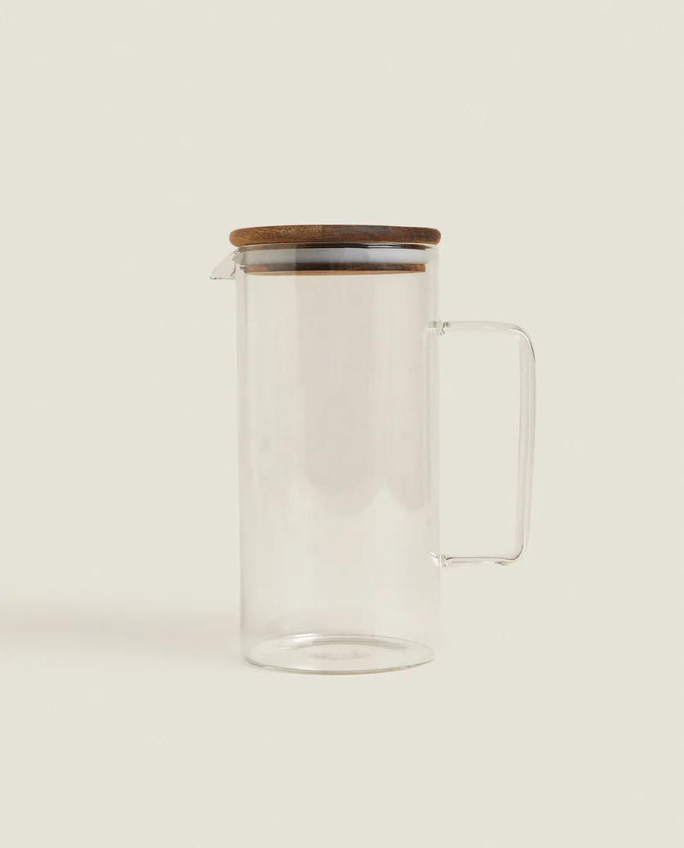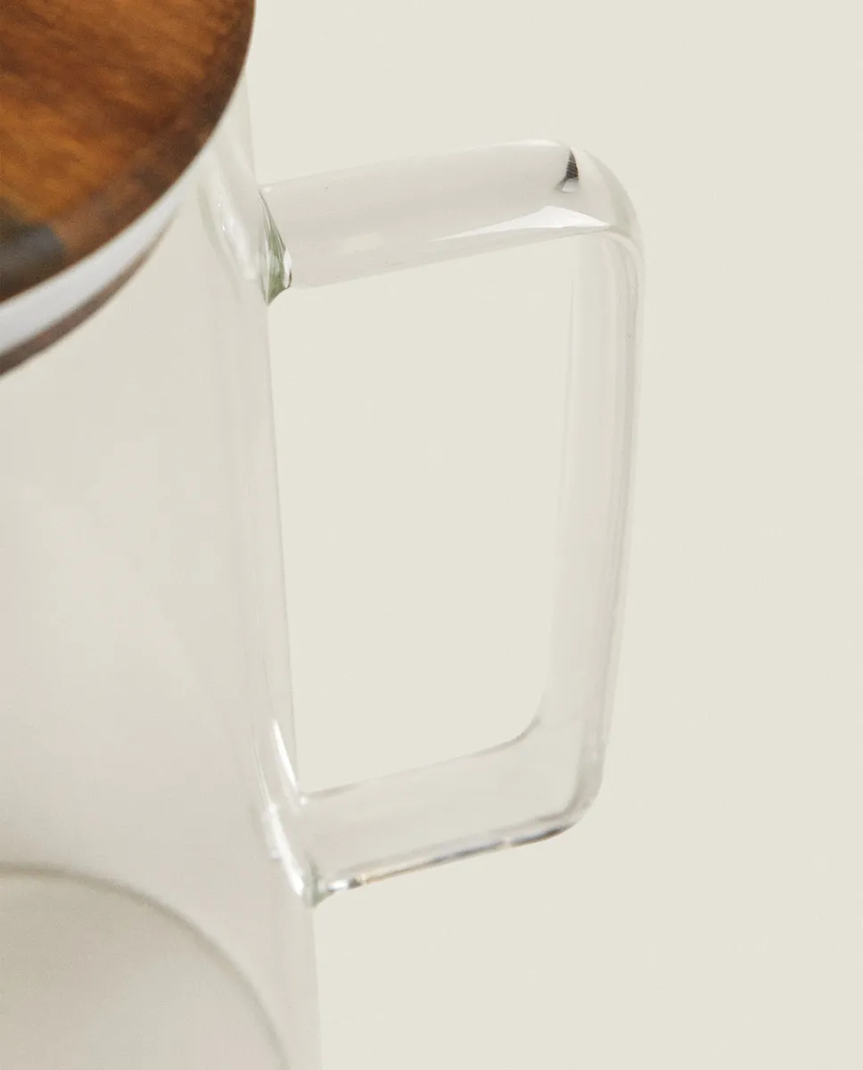 Прозрачный кувшин из боросиликатного стекла с боковой ручкой и деревянной крышкой.