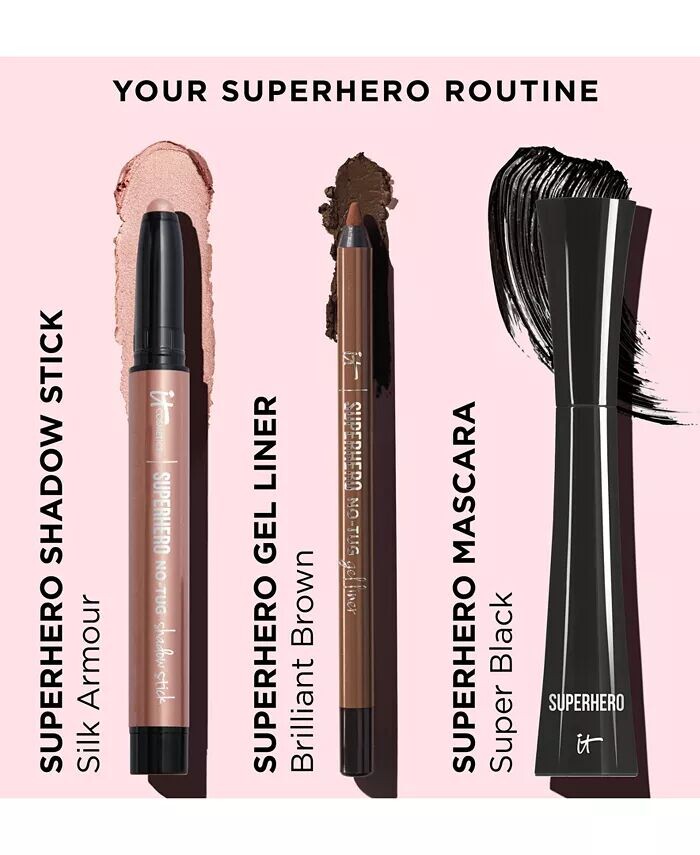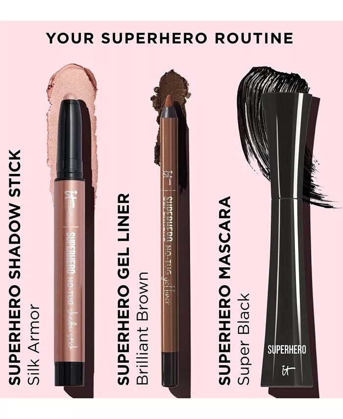 ЧТО ОНО ДЕЛАЕТ: Сверхгладкое скольжение, суперрастушевка, супернесминаемость, супер-укладка и суперстойкость на весь день. Доступно в 14 перламутровых и матовых оттенках. Идеально подходит для чувствительных глаз или жирных век. >Содержит трипептидный комплекс, гидролизованный коллаген и кофеин. Разработанная с учетом знаний пластических хирургов и опыта дерматологов в области ингредиентов и средств по уходу за кожей, IT Cosmetics создает формулы, решающие проблемы, заботящиеся о коже и дающие видимые результаты. КЛЮЧЕВЫЕ ИНГРЕДИЕНТЫ: Кофеин, как известно, помогает при воспалении и отечности, одновременно заметно осветляя. Известно, что гидролизованный коллаген повышает эластичность кожи и заметно уменьшает тонкие линии и морщины. КАК ИСПОЛЬЗОВАТЬ: Проведите пальцем по экрану век, а затем легко растушуйте кончиками пальцев. Для более расплывчатого образа теней для век используйте свою любимую кисть для теней IT Cosmetics. Завершите суперпреображение глаз с помощью гелевой подводки Superhero No-Tug и туши Superhero.