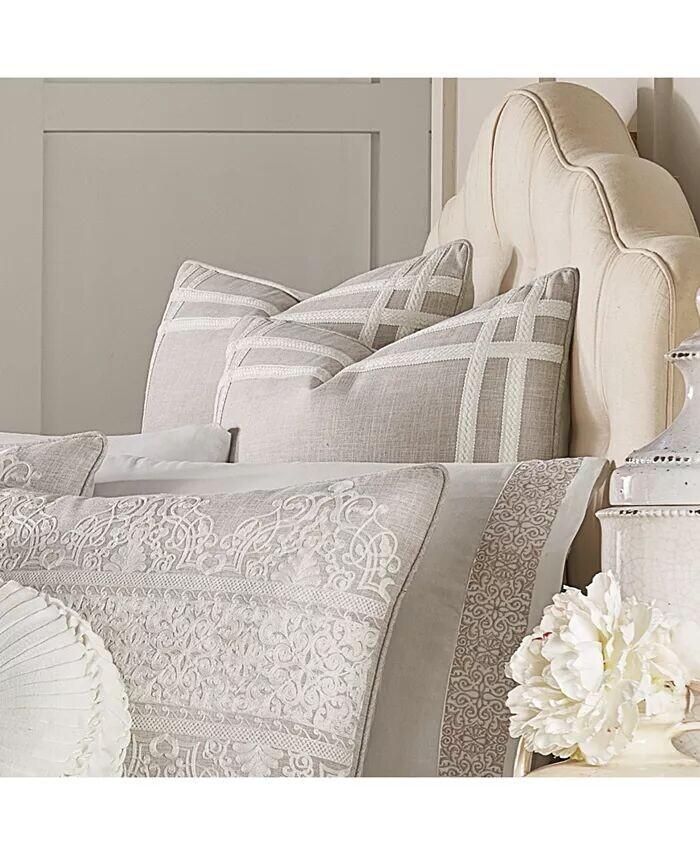 Евро-имитация состоит из двух рядов канители кремового цвета, прошитых на искусственном льне бежевого цвета. Подушка превращается в искусственный лен белого цвета. Подушка отделана 1/4 бежевой окантовкой.