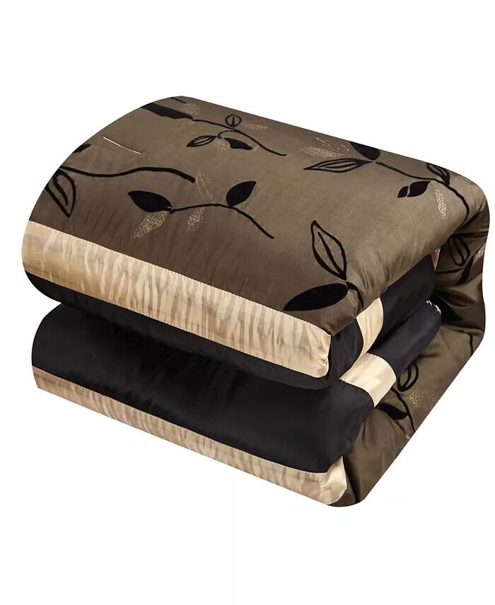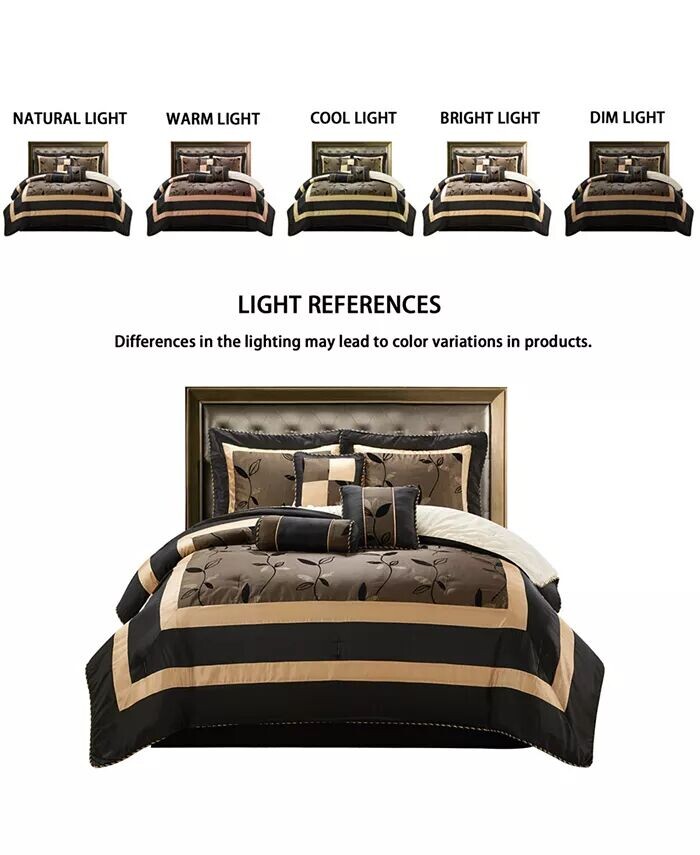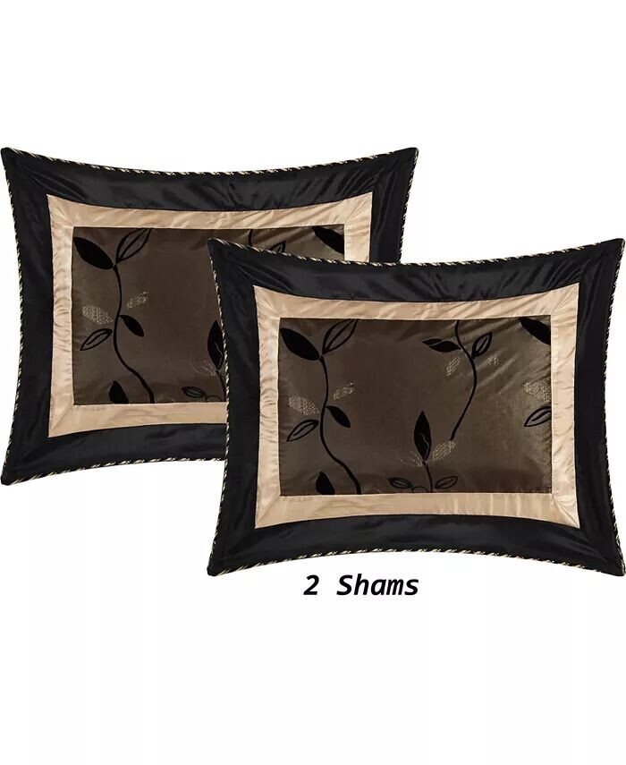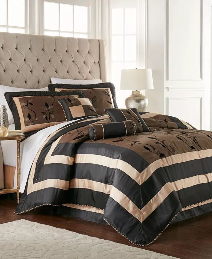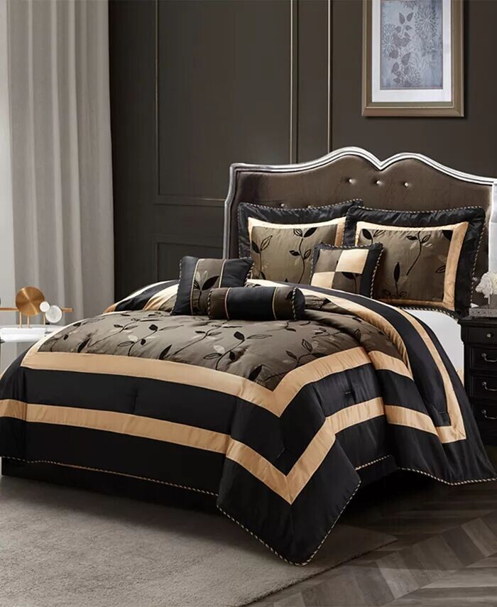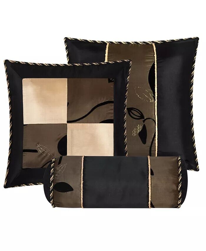 Пасторальное одеяло украшено черным флокированным современным узором в виде листьев с металлическими принтами на ткани из тафты, обрамленным полосами контрастных цветов и отделанным шнуровой окантовкой по краю. Соответствующие модели также оформлены в тафту и отделаны такой же шнуровой отделкой. Одеяло и декоративные подушки наполнены полиэстером, что делает их мягкими и удобными, но при этом не слишком тяжелыми. Подушки, сочетающиеся друг с другом, добавляют интереса благодаря клетчатому узору, центральной полосе флокированной ткани, украшенной однотонной тканью, а воротник, отделанный окантовкой. Подходящие накладки подходят к кроватным подушкам стандартного размера и имеют отделку со шнурком. Сшитая на заказ юбка-кровать украшена полосой из контрастной ткани.