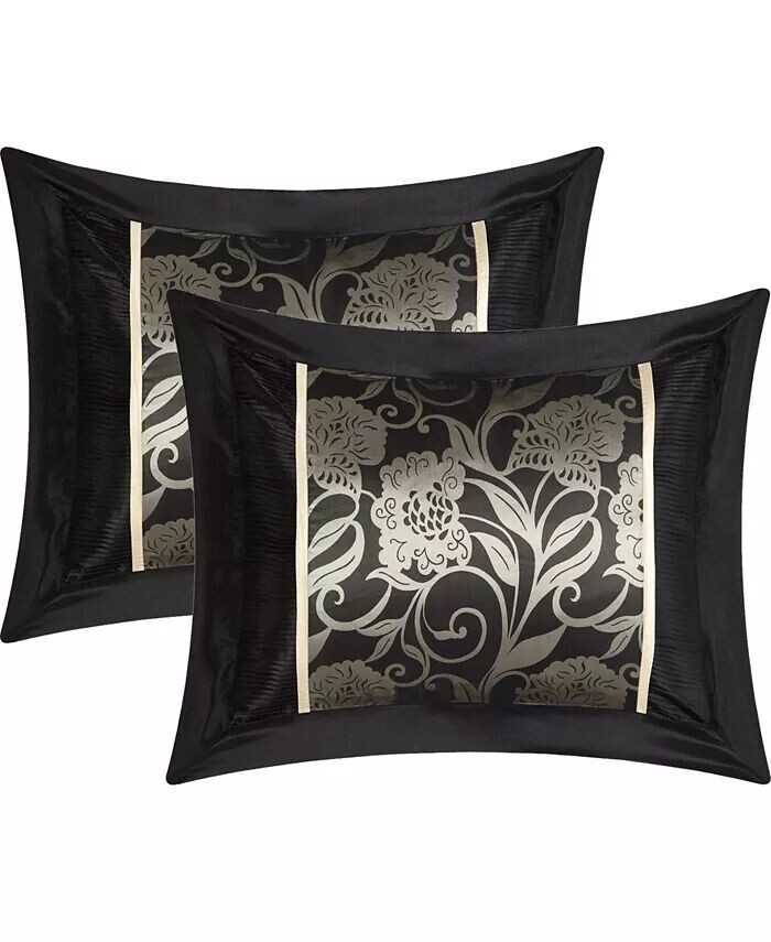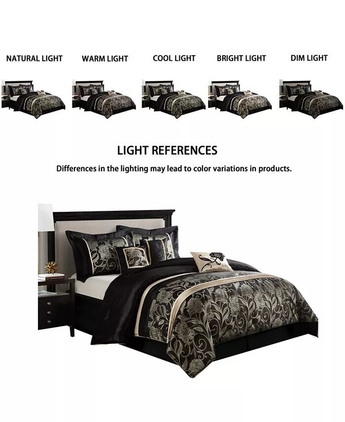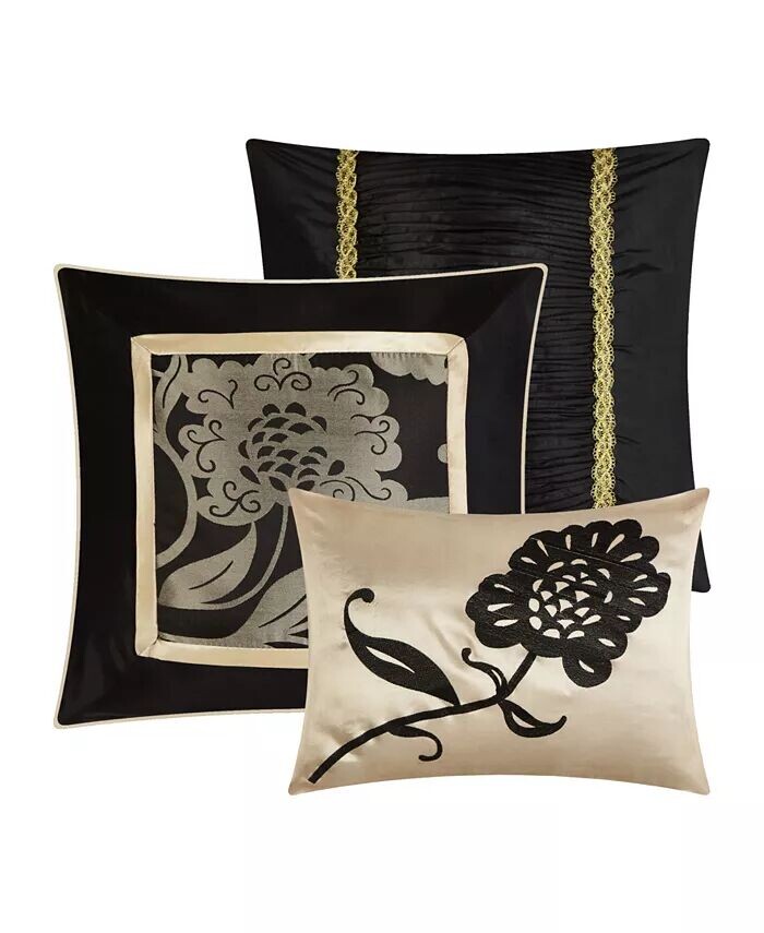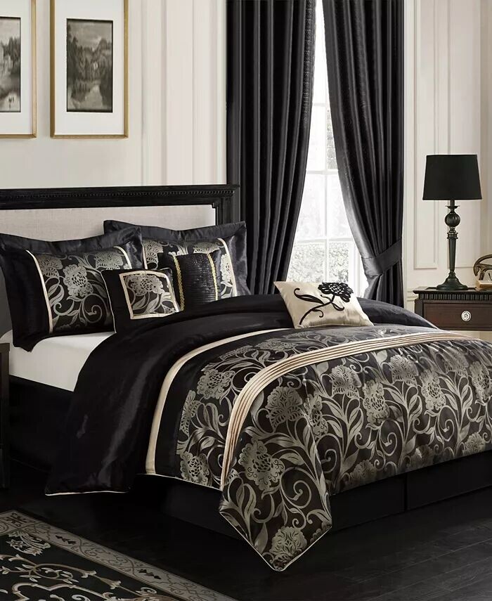 Этот стильный, изысканный комплект одеял украшен серебряным цветочным узором на черном фоне с блестящими золотыми акцентами. Элегантный комплект постельного белья Mollybee включает модное одеяло, две накидки, юбку и три декоративные подушки. Одеяло и подушки имеют наполнитель из полиэстера.