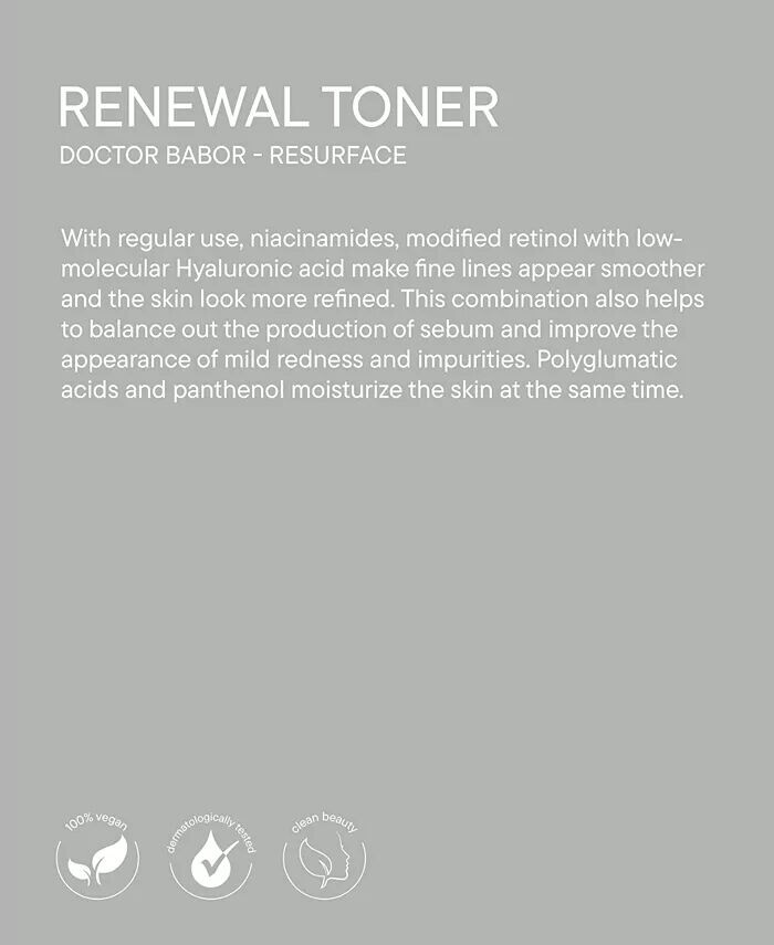 BABOR Renewal Toner — это разглаживающий кожу тоник с гиалуроновой кислотой, модифицированной ретинолом, который поддерживает процесс обновления кожи и помогает уменьшить тонкие линии и морщины при регулярном использовании. Это также помогает нормализовать выработку кожного сала и уменьшить пятна и небольшие покраснения. Полиглутаминовая кислота и ниацинамид интенсивно увлажняют кожу, регенерируют кожу и оптимально подготавливают ее к последующему уходу. Инновационный витамин А, модифицированный высокоэффективным комплексом гиалуроновой кислоты и ниацинамида, также поддерживает регенерацию кожи и мягко улучшает ее текстуру. Поры очищаются, кожа получает всесторонний уход и готовится к дальнейшему впитыванию питательных активных ингредиентов. Обогащенный эксклюзивным экстрактом Babor Biogen, венцом исследований Babor, стимулируются собственные процессы кожи и, таким образом, повышается ее подвижность.